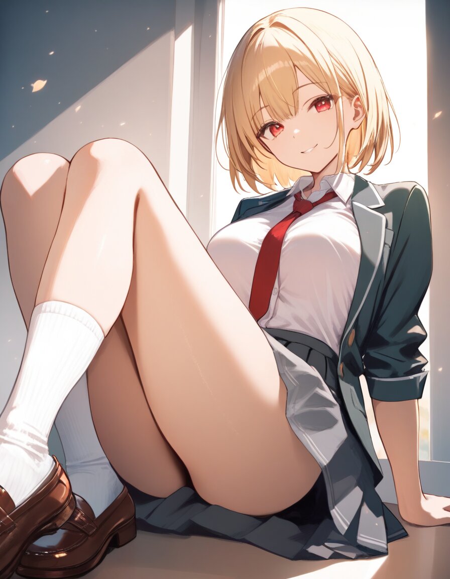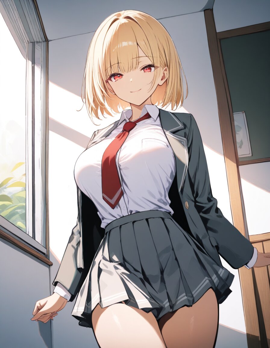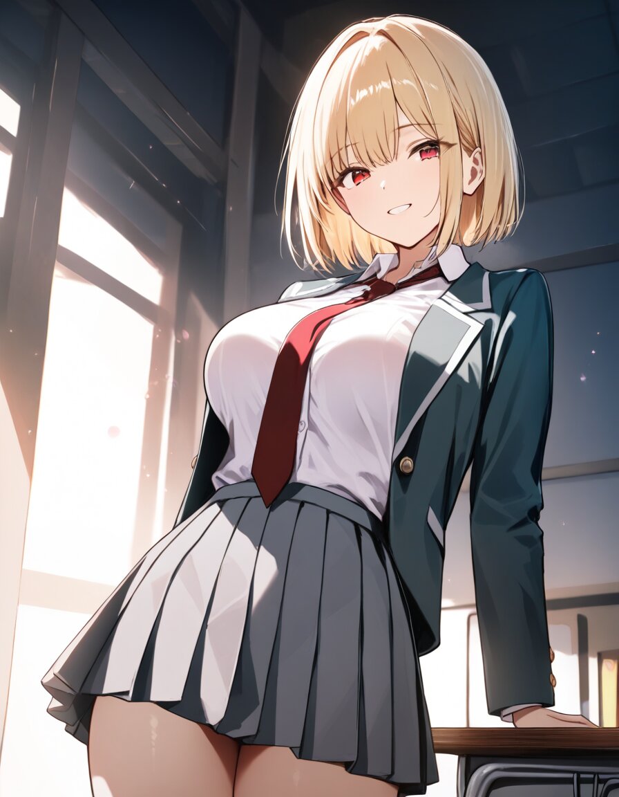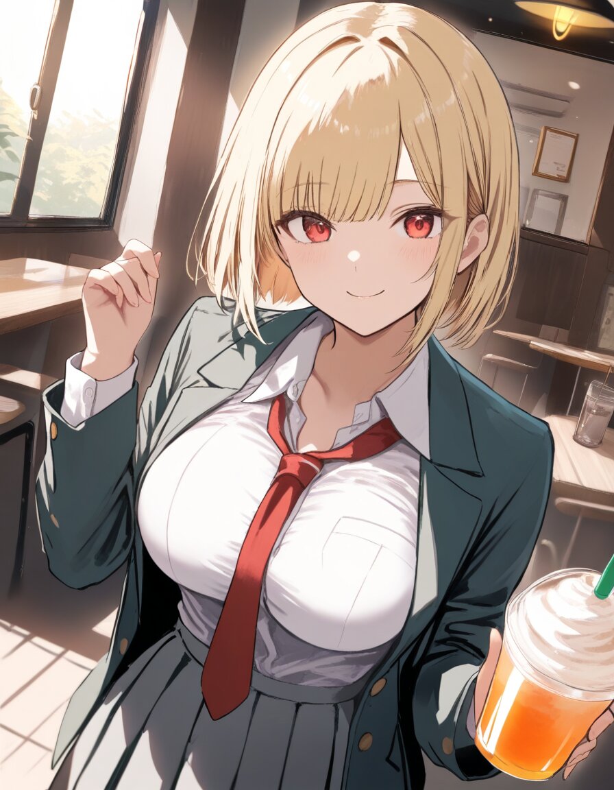 cafe, 1girl, solo, short hair, blonde hair, straight hair, red eyes, large breasts, smile, smooth skin, school uniform, medium green-gray blazer, white blouse, (unbuttoned shirt:0.8), red necktie loosely tied, gray pleated skirt, drink, masterpiece, great score, high score, absurdres