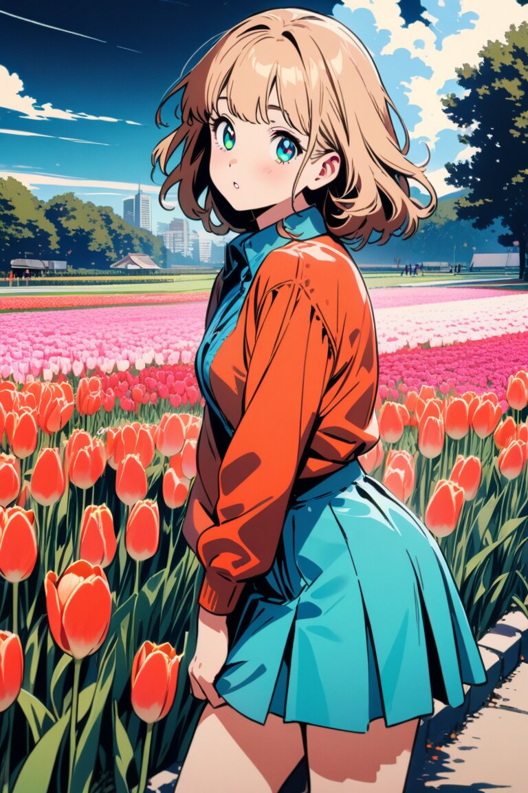 masterpiece, best quality, beautiful detailed eyes, ultra-detailed, finely detail, highres, perfect anatomy, 1girl, solo, retro style, kawaii illustration, city pop picture, city pop colors, Kyoto Animation, 1980s fashion, (fine), (tulip field), park, shirt, skirt, sky