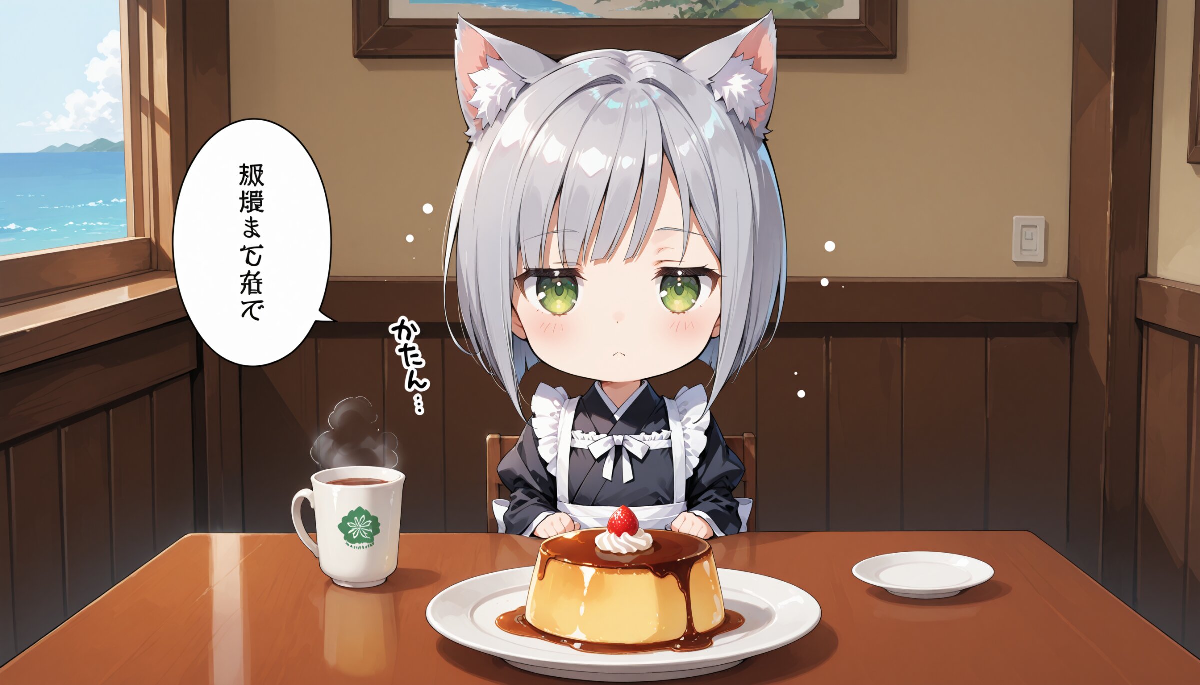 (masterpiece, best quality, high quality, 8k,) (watercolor style illustration, :1.3) solo, chibi, 1girl, ninja flat chest, (silver short-bob hair,:1.4) green eyes, jitome, (silver-cat ears,:1.2) maid-cloth, laugh, hokding katana Custard pudding.Caramel sauce.plate table cafe, sound effect, japanese text, speech bubble, morning, ocean viewing high fantasy style yummy black-board "ninja pudding"