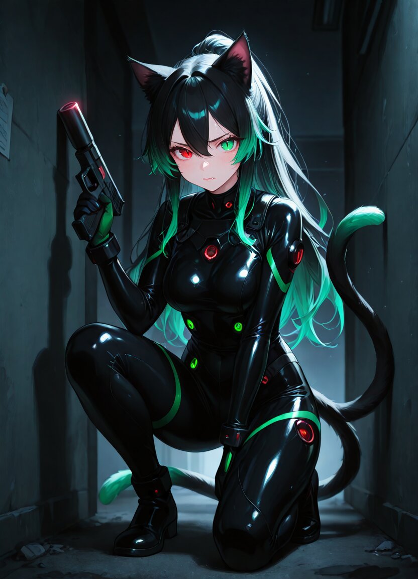 at night,no light,office,indoor,darkness, 1girl,solo,sneaking,sneaking suit,holding,on one knee,handgun,suppressor,transceiver, hiding,on wall,looking at viewer,serious, BREAK 1 girl,20-year-old,hair between eyes,long hair tied back,multicolored hair|black hair|white gradient hair,white dip-dye hair,body,medium breasts,heterochromia,green left eye,red right eyes,slit pupils,narrow eyes,cool-face,fang,fair skin,shiny skin,shiny hair,cat ears,(black cat tail, multicolored tail, white gradient tail),, appropriate posture,appropriate configuration,ideal ratio body proportions,perfect anatomy, <lora:Fixhands_anime_bdsqlsz_V1:1>, masterpiece,best quality,newest,absurdres,highres,ultra high res,8K UHD,hyper-detailed,
