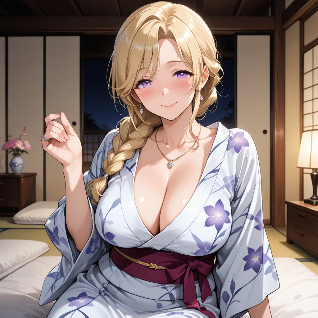 mature female, blond_hair, purple eyes, single braid, hair over shoulder, necklace, large breasts, bedroom eyes, embarrassed, smile, 1girl, solo, bangs, yukata, best quality, amazing quality, Wedding_rings_are_worn_on_the_ring_finger_of_womens_left_hand, japanese_bedroom, sitting, futon