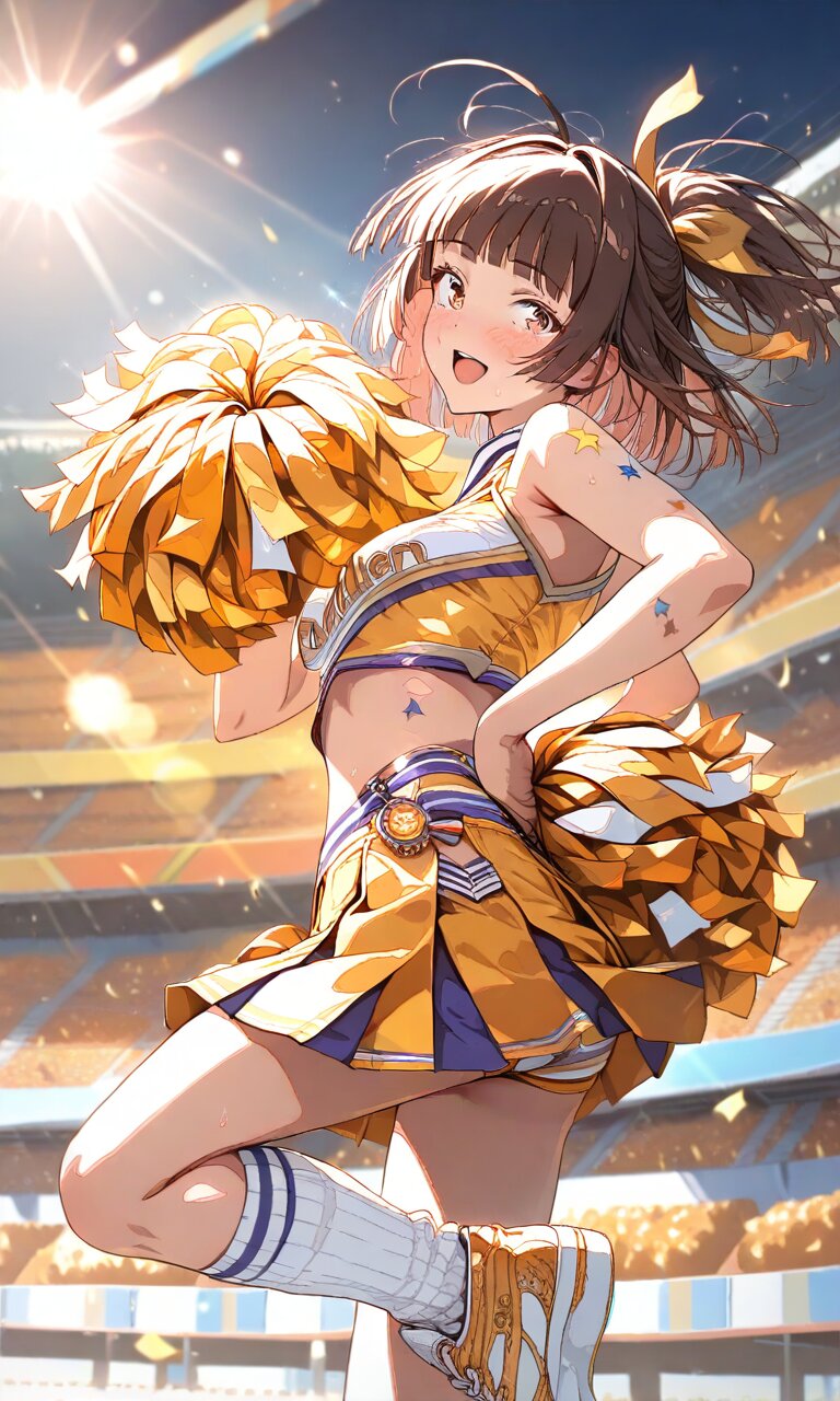 anime-style, solo, 1girl, brown hair, brown eyes, blunt bangs, ahoge, short hair, straight hair, hime cut, delicate face, detailed face, detailed skin, masterpiece, best quality, insanely detailed, highly detailed, intricate, detailed eyes, beautiful eyes, beautiful face, beautiful hair, beautiful, 16k, cheerleader, detailed and vibrant, (Stadium seating:1.2), hair ribbon, (golden cheerleader uniform:1.5), sleeveless, (pleated mini skirt:1.5), sneakers, knee socks, standing on one leg, cheerful, dancing, (one hand on hip:1.3), (one hand raised up:1.3), (holding large golden pom-poms in both hands:1.5), at noon, light atmosphere, lens flare, sunlight, sunbeam, shining lights, open mouth, cheerful smile, floating hair, floating skirt, (side view:1.3), wide view