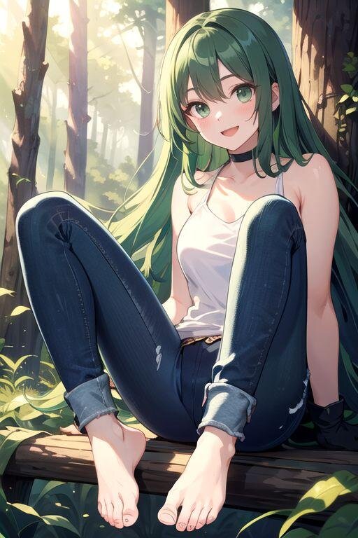 green hair, very long hair, green eyes, gloves, barefoot, (long toes:1.3), (long jeans:1.4),smile,open mouth, forest background