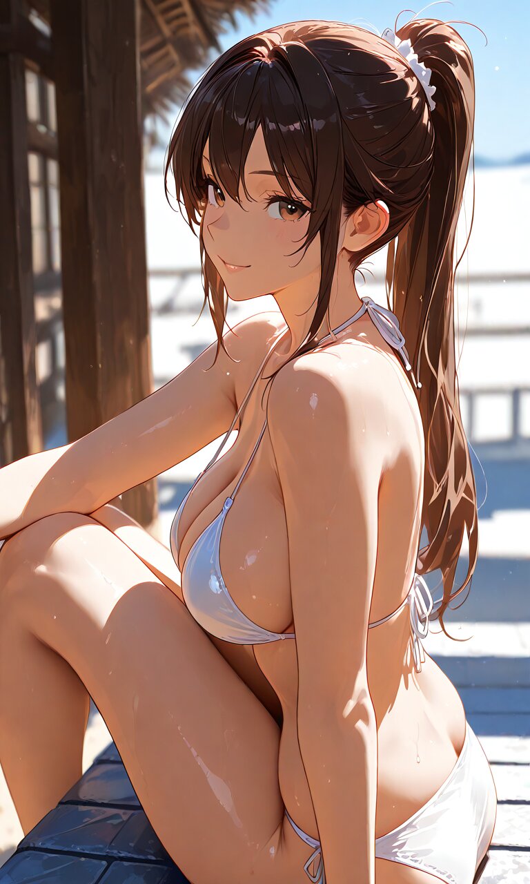 (best quality),(masterpiece),(ultra detailed),1 lady, brown hair, long ponytail, smile, big breasts, white bikini, sitting, side view,