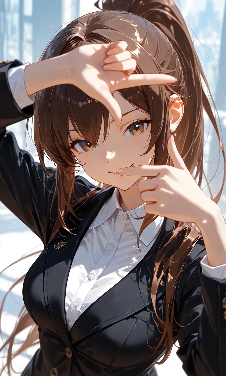 (best quality),(masterpiece),(ultra detailed),1 lady, brown hair, long ponytail, smile, smile,finger frame