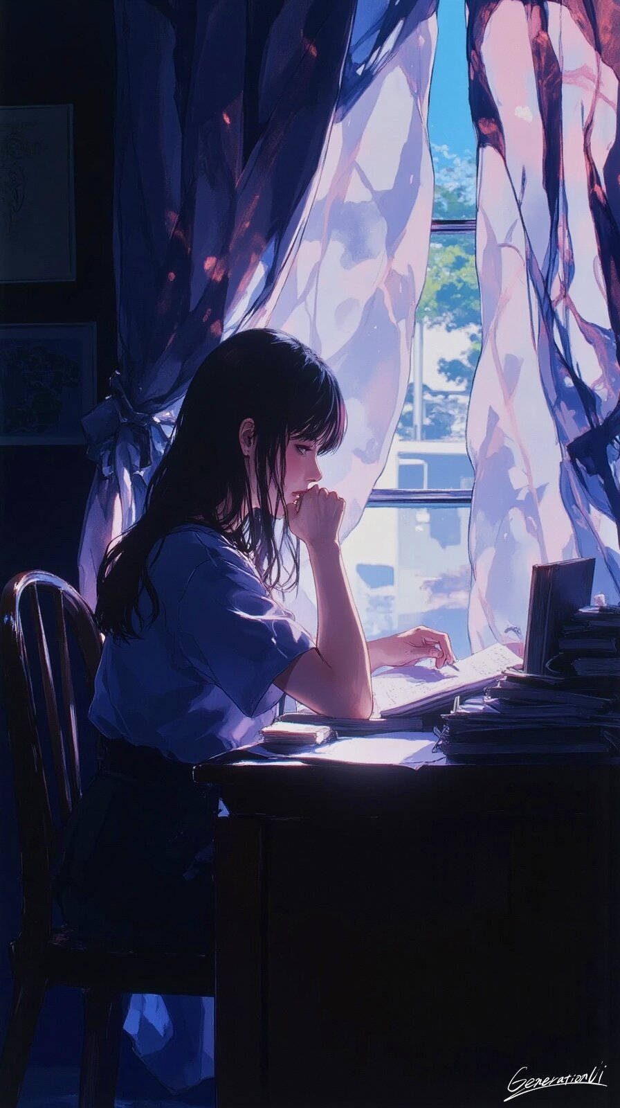 彼女はペンを止め、頬に手を当てたまま、ふと遠くの空を思った。