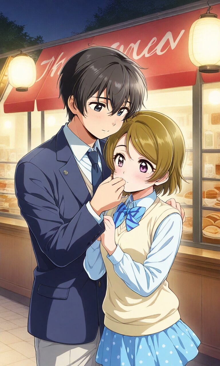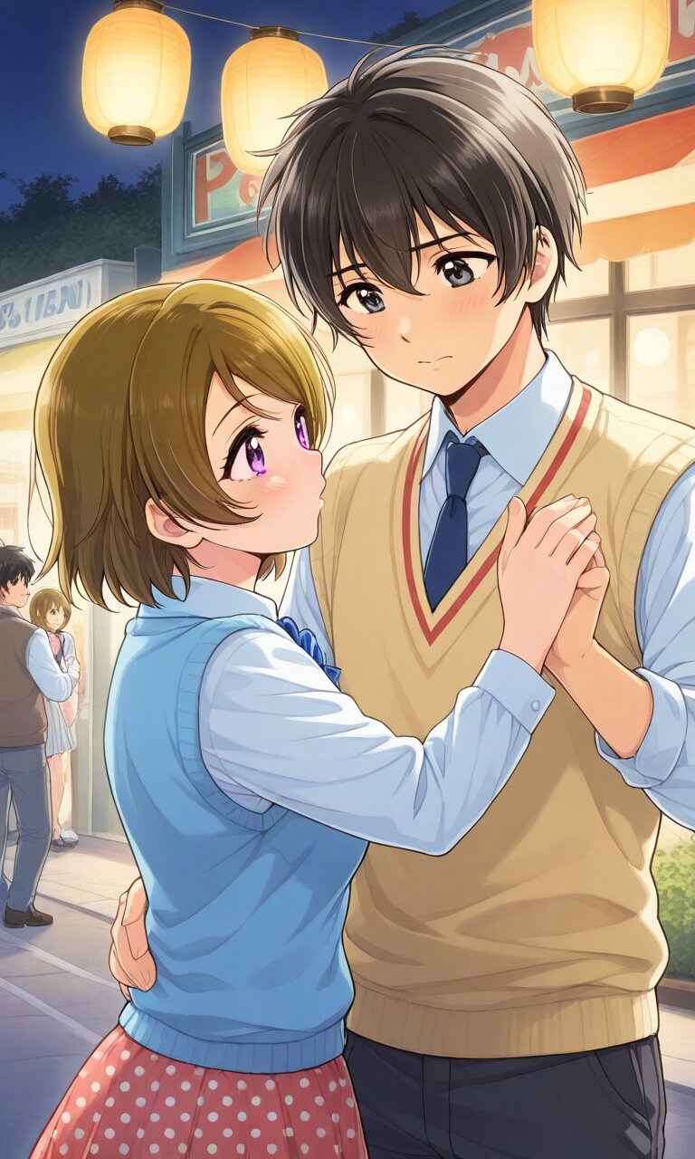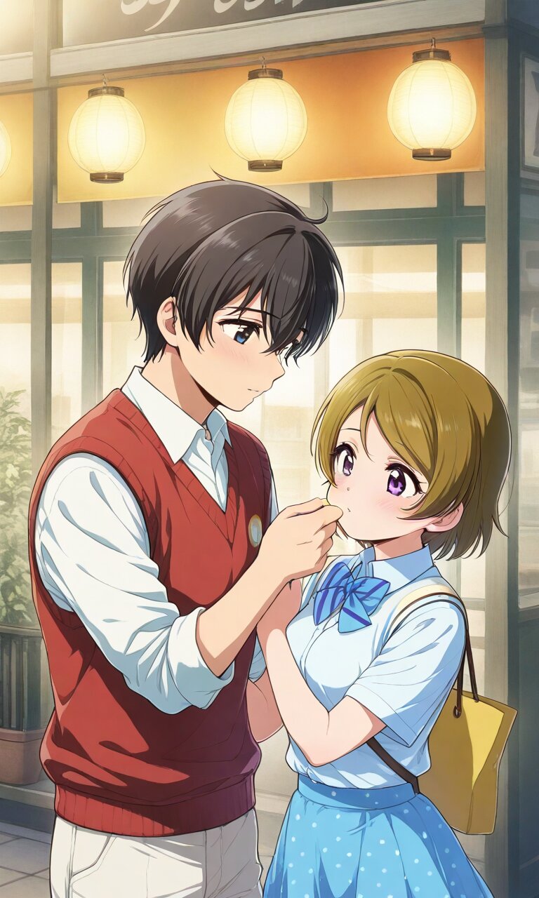 Couple, boy and girl, two people only,absurdres, ultra-detailed, master piece, high resolution, 8k, Boy, girl, couple, Masterpiece, best quality, extremely detailed, young couple in 1960s Showa-era Japan, young man and young woman, woman in polka-dot skirt, man in sweater vest, woman feeding man dorayaki, hands close, retro vendor stall with lanterns, busy shopping street, soft daylight, perfect anatomy, sweet romantic moment. BREAK the boy(original boy,black hair,short hair, black eyes) BREAK the girl(<lora:hanayo-koizumi-s1-ponyxl-lora-nochekaiser:1>, hanayo koizumi, short hair, brown hair, purple eyes, large breaths),