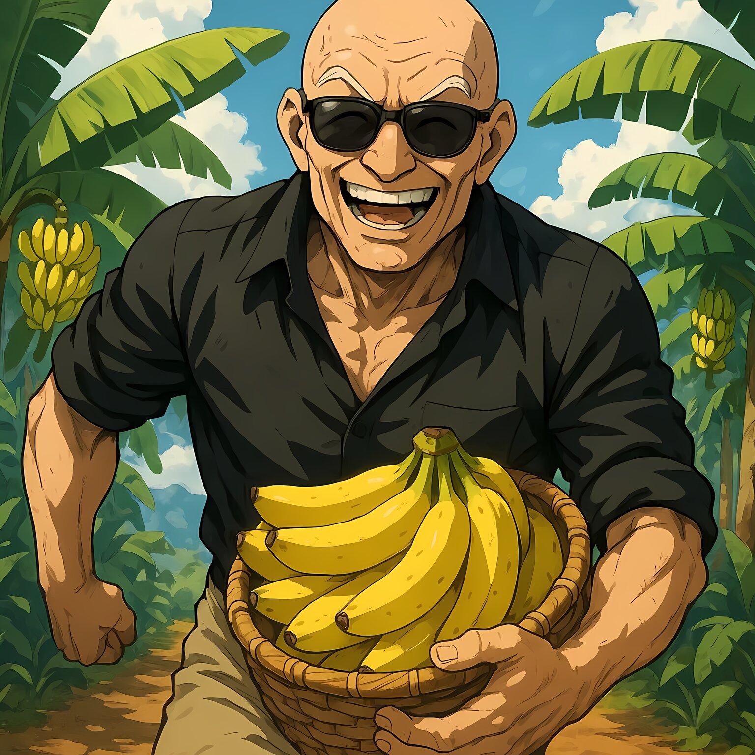 映画のポスターの様なイラスト。映画のラストシーンの様なダイナミックな構図と情景。オフィシャルアート。 日本のアニメの画風の渋いキャラ。サングラスをかけたハゲ頭でマッチョの老人。熱帯の国でバナナ農家を営んでいる彼は大きなカゴに収穫したバナナを抱えて満面の笑顔。