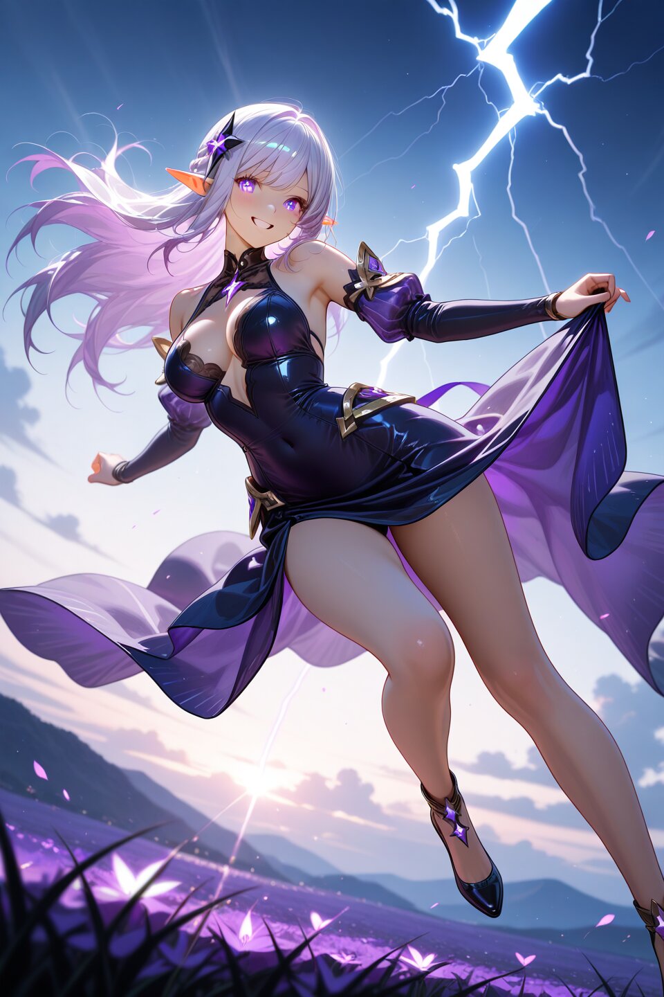 (The theme is a girl with a Lightning attribute), (The background is a field of Lightning, shining with intensity), BREAK 1girl, (dynamic angle, dynamic pose, dynamic action), BREAK elf girl, (sparkling amethyst eyes), (shine Lightning hair, light purple hair), pointy ears, Mysterious smile, BREAK (The girl is wearing a sheer, purple colored long dress made of Lightning and Lightning particles). BREAK ((The effect of a torrent of Lightning surrounds her, Lightning erupts from her body))., anime style, anime color,, <lora:elf-san_alpha1(AnimagineV31):0.7> <lora:Elf-san_alpha7(IL2.0):0.7>