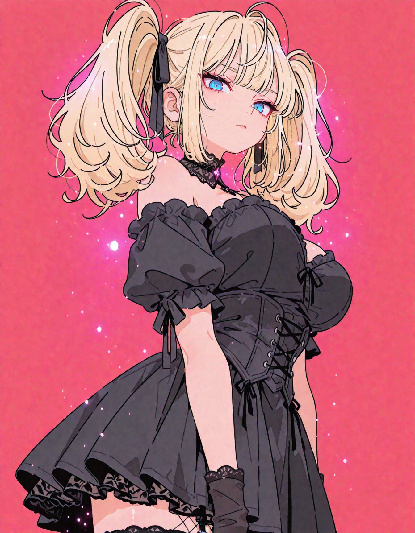 from side, looking at viewer (upper body:1.1) from below, looking down looking at viewer, 1girl, mature female, blonde hair, medium hair, messy hair, wide twintails, big hair, black ribbon, blue eyes, tsurime, sanpaku, goth fashion, black dress, off shoulder, bare shoulder, off-shoulder dress, puffy short sleeves, black gloves, detached collar, lace collar, underbust, large breasts, miniskirt, lace thighhighs, black thighhighs, asymmetrical thighhighs, single fishnet thighhigh, black arm ribbon dogeza, (simple background:1.0), scarlet background, masterpiece, best quality, amazing quality, very aesthetic, absurdres, newest, professional art lots of details, , overexposure, shiny-glistening, (watercolor style:0.0), (pastel color style:1.0) 4ur4_illu,shiny, glowing, glowing particles, glowing light particles, light particles, scarlet heart <lora:noline (1):-0.5> <lora:sdxl2-flat2-512b:-0.2> <lora:facelightup_xl_v10:0.5> <lora:V2_yakumo_alchemy:0.5> <lora:Aura_illu:0.1>