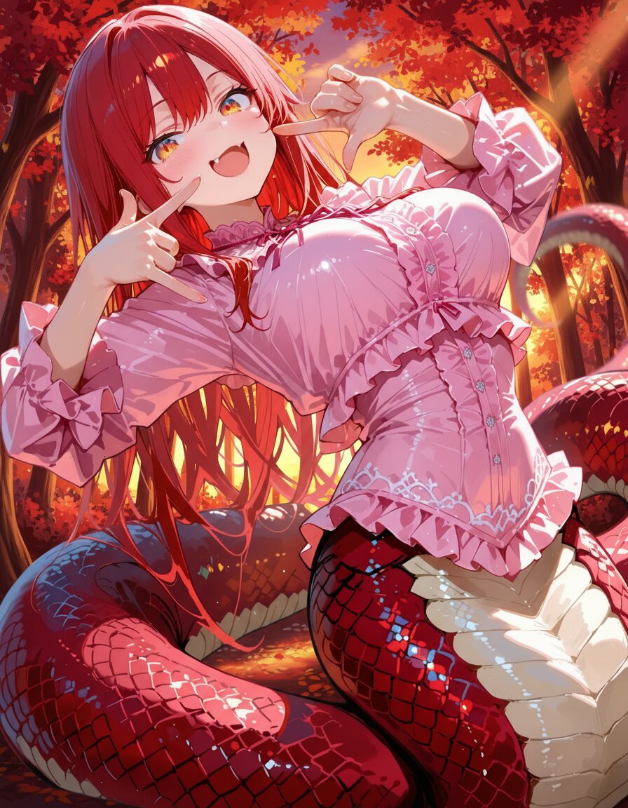 dynamic lighting,sunset red sky,in autumn forest,red maple leaves,1girl,solo,(dynamic angle),fullbody shot,(Lamia),red hair,straight long hair,big smile,open mouth,fang,frilled pink blouse,large breasts,finger frame pose,red-scaled snake lower body,((masterpiece, best quality, extremely detailed, absurdres)),