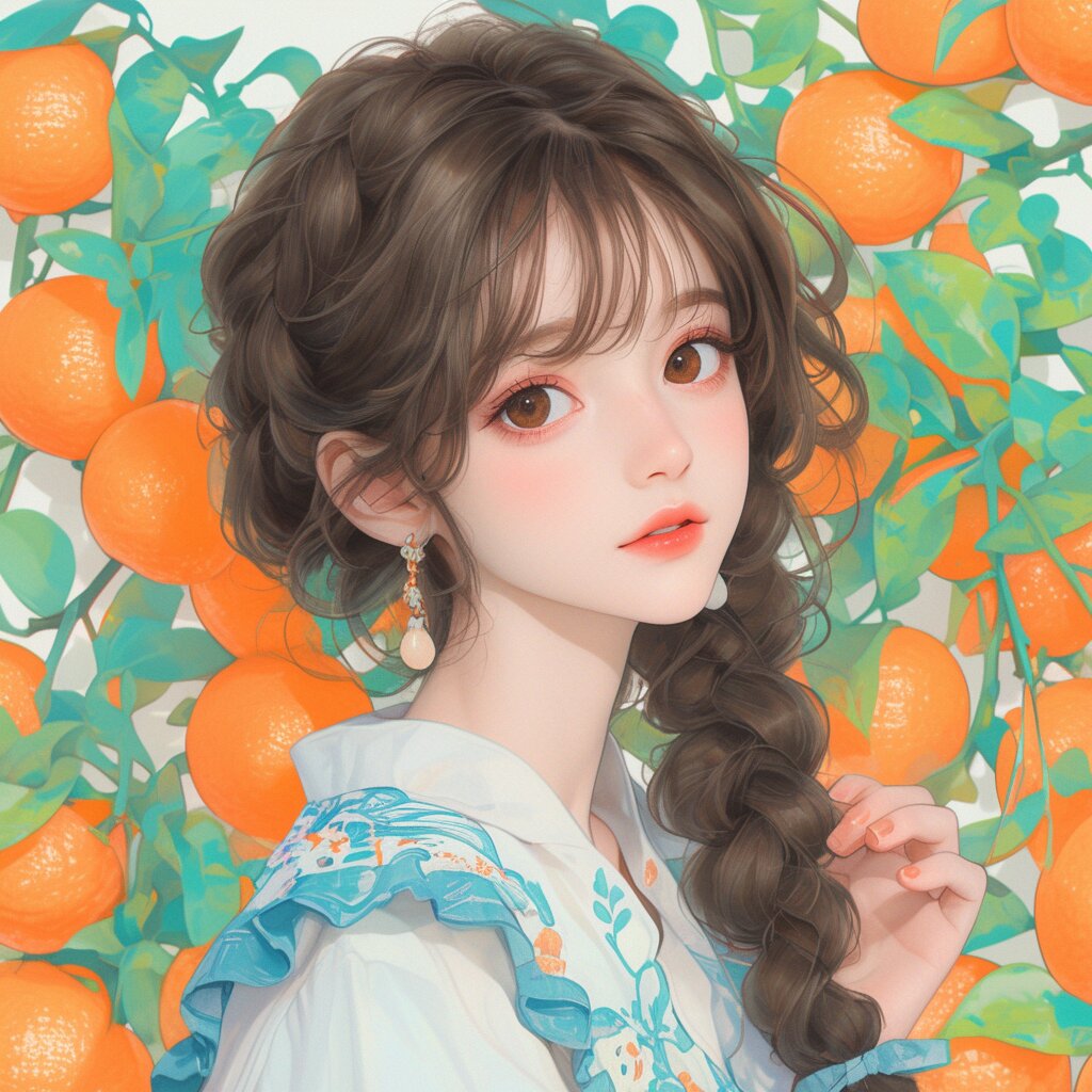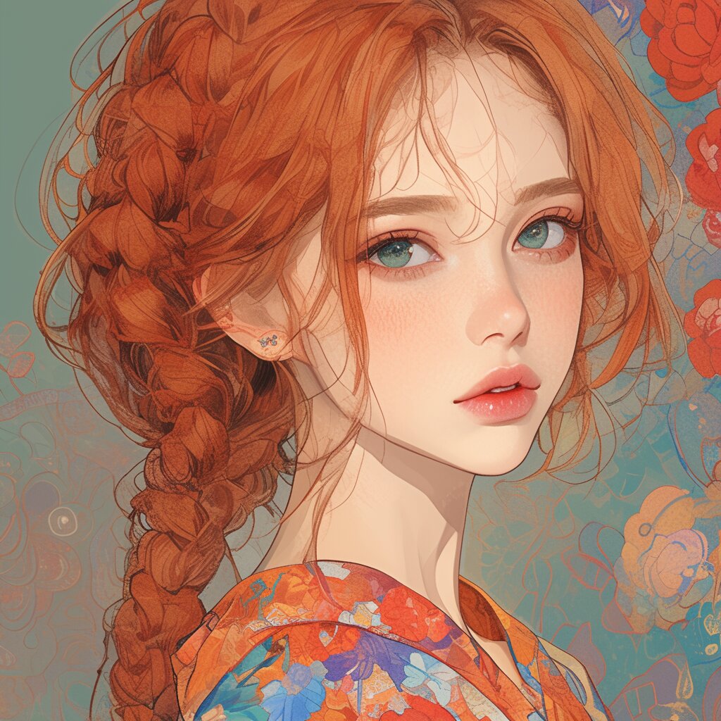 (delicate illustration), (pastel color style illustration, flat colors, pale colors), 1girl, (braided bangs, close-up, ginger hair, forehead). (fashion illustration, elegant orange, ultra-intricate detailed), flat design, bold colors, patterned fabric, beautiful composition. --ar 1:1 --niji 6 --raw --profile --stylize 1000