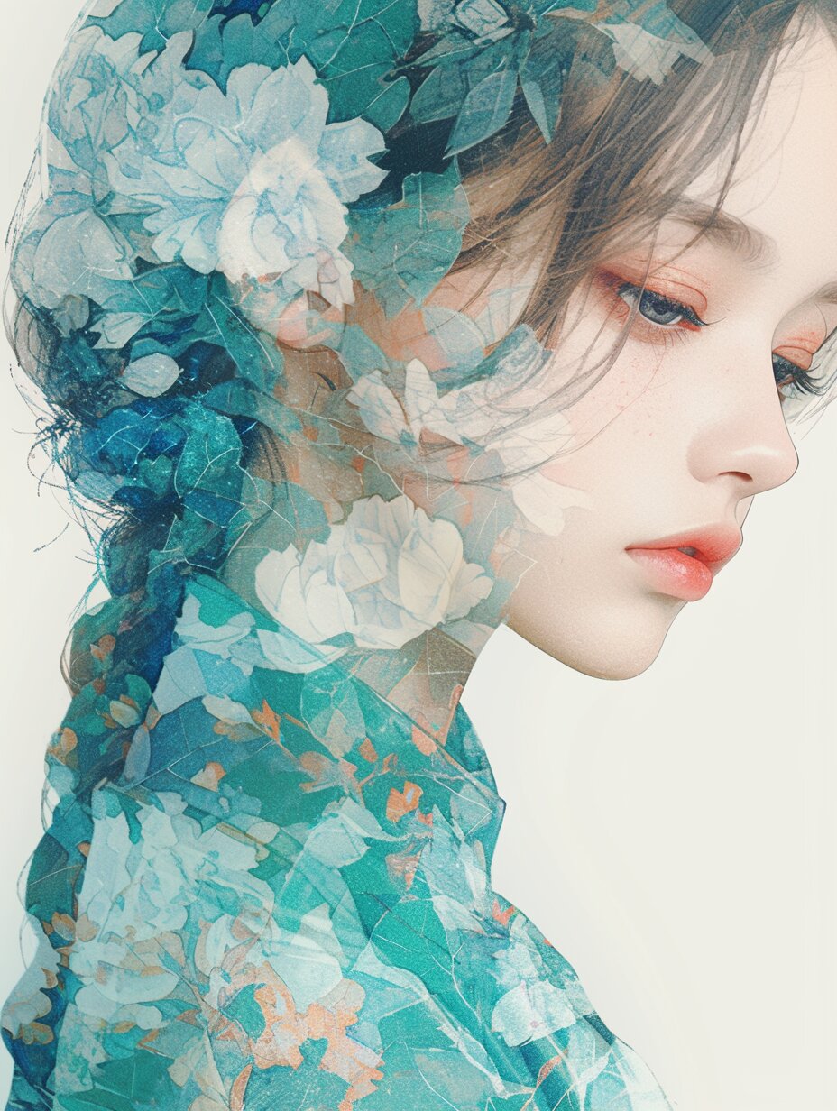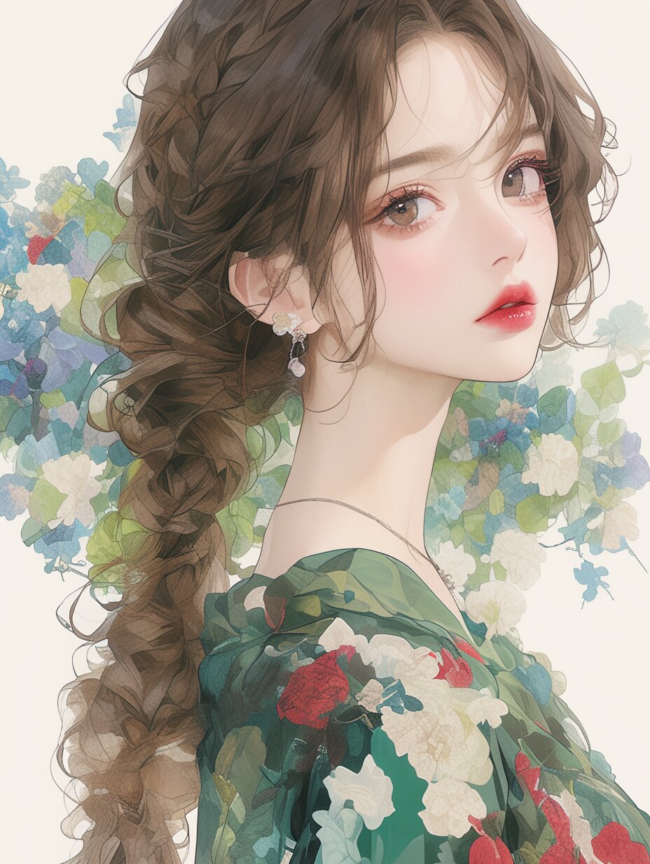 (delicate illustration), (pastel color style illustration, flat colors, pale colors), 1girl, (braided bangs, close-up, forehead). (fashion illustration, elegant, ultra-intricate detailed), flat design, bold colors, patterned fabric, beautiful composition. --niji 6 --raw --profile --stylize 1000