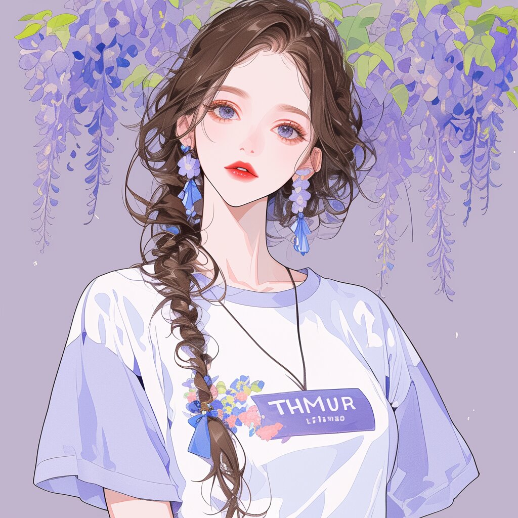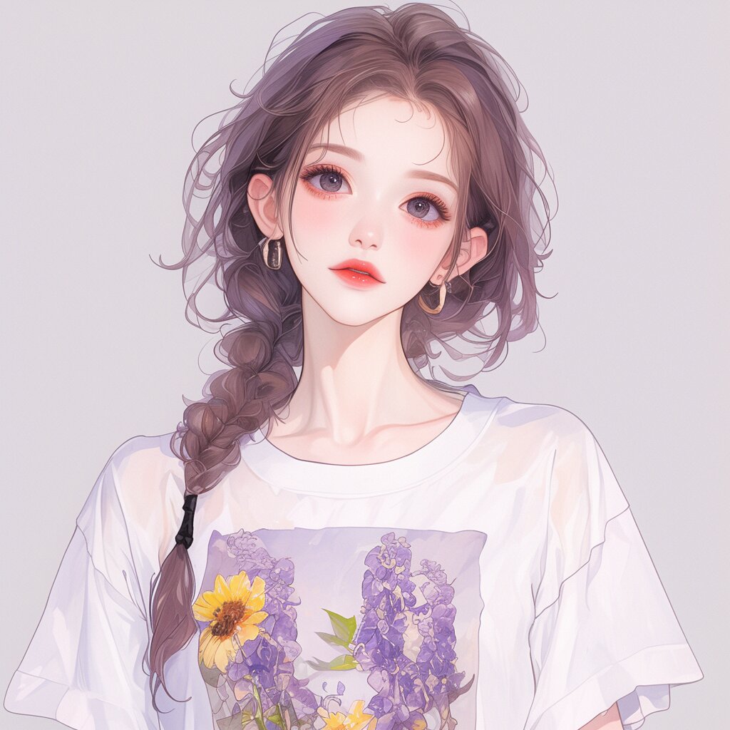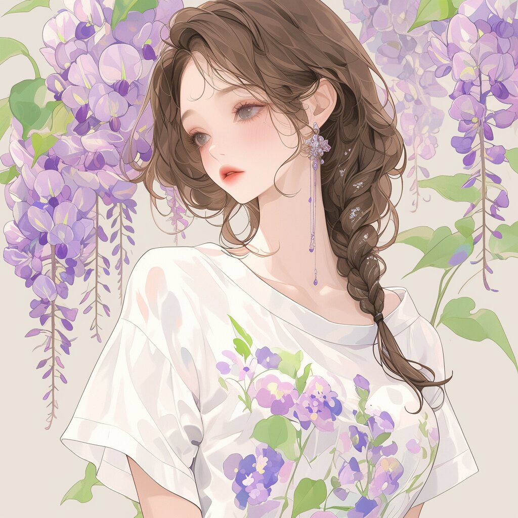 (delicate illustration), (pastel color style illustration, flat colors, pale colors), 1girl, braided bangs, french braid, forehead. over sized tee, short sleeves, Floral print tee, (cloud-like clothes, White Fluffy clothes). (fashion illustration, elegant, ultra-intricate detailed), flat design, bold colors, wisteria, patterned fabric, beautiful composition. --ar 1:1 --niji 6 --raw --profile --stylize 1000