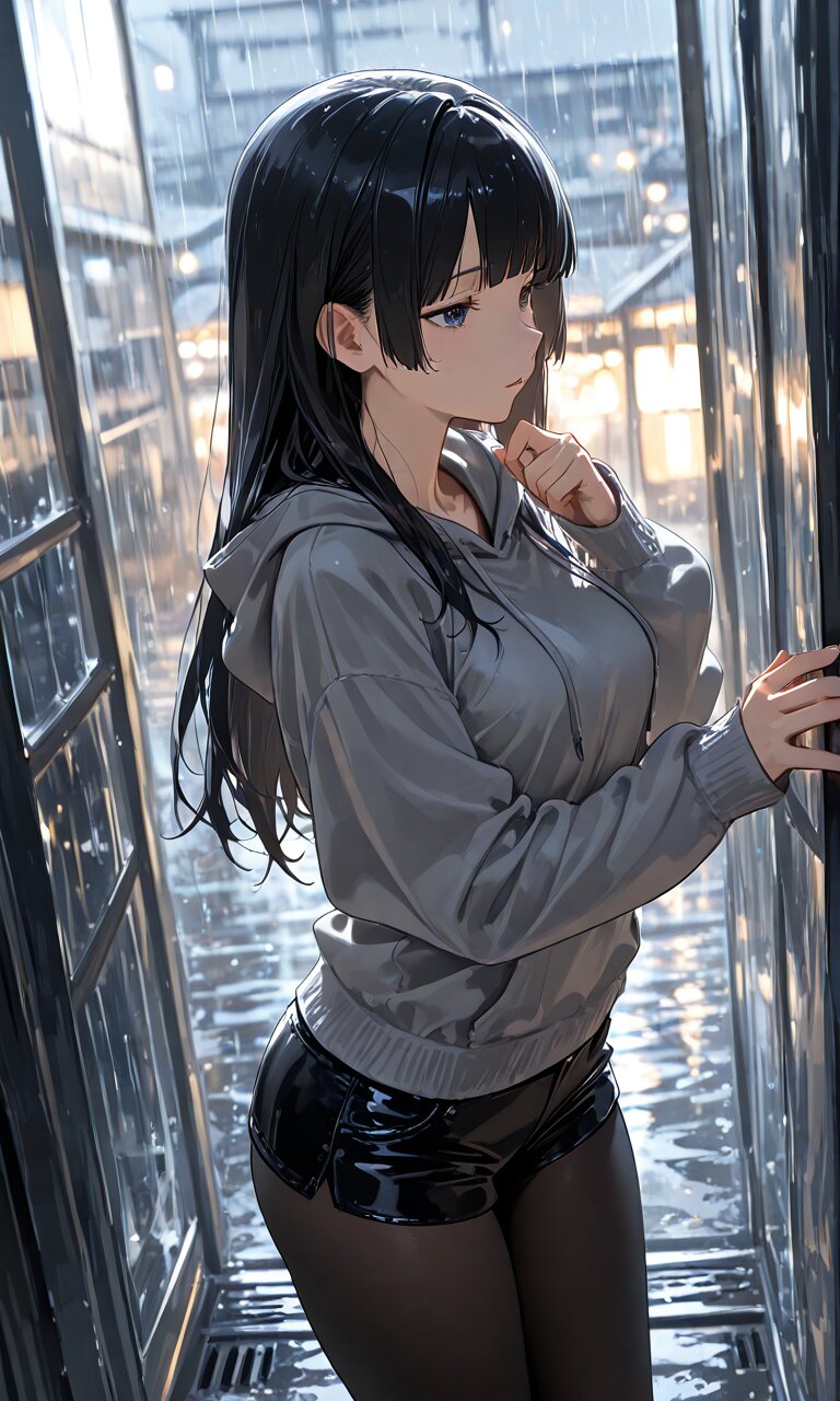 (best quality),(masterpiece),(ultra detailed),1 lady, long hair, black hair, blunt bangs, gray hoodie, short pants, black pantyhose, rain