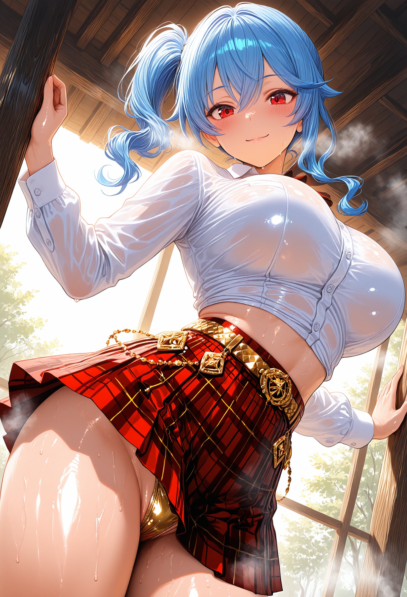 (white dress shirt:1.5),(large bleast and hips),(sweat:1.2),(steam:1.3), (calm smile), (glossy skin:2.2),(blue hair),(side ponytail),(red eyes), (upper body:1.5),(stomach:1.3),(ornate golden belt), (jewel decorations),(shiny metallic belt),( luxury design),( detailed accessory),( reflective gold), (red tartan plaid ultra mini skirt:1.5),,(gold micro panties),(panty shot:1.5), (outdoor background), (bright sunlight),(dynamic angle:1.4),(dynamic pose:1.6), masterpiece, best quality, ultra-detailed, 8k resolution, very aesthetic, <lora:noobai_ep11_stabilizer_v0.11_fp16:0.7> <lora:StS-Illustrious-Detail-Slider-v1.0:2.> <lora:sdxl-hairdetailer_02:2> <lora:xl_more_art-full_v1:1>