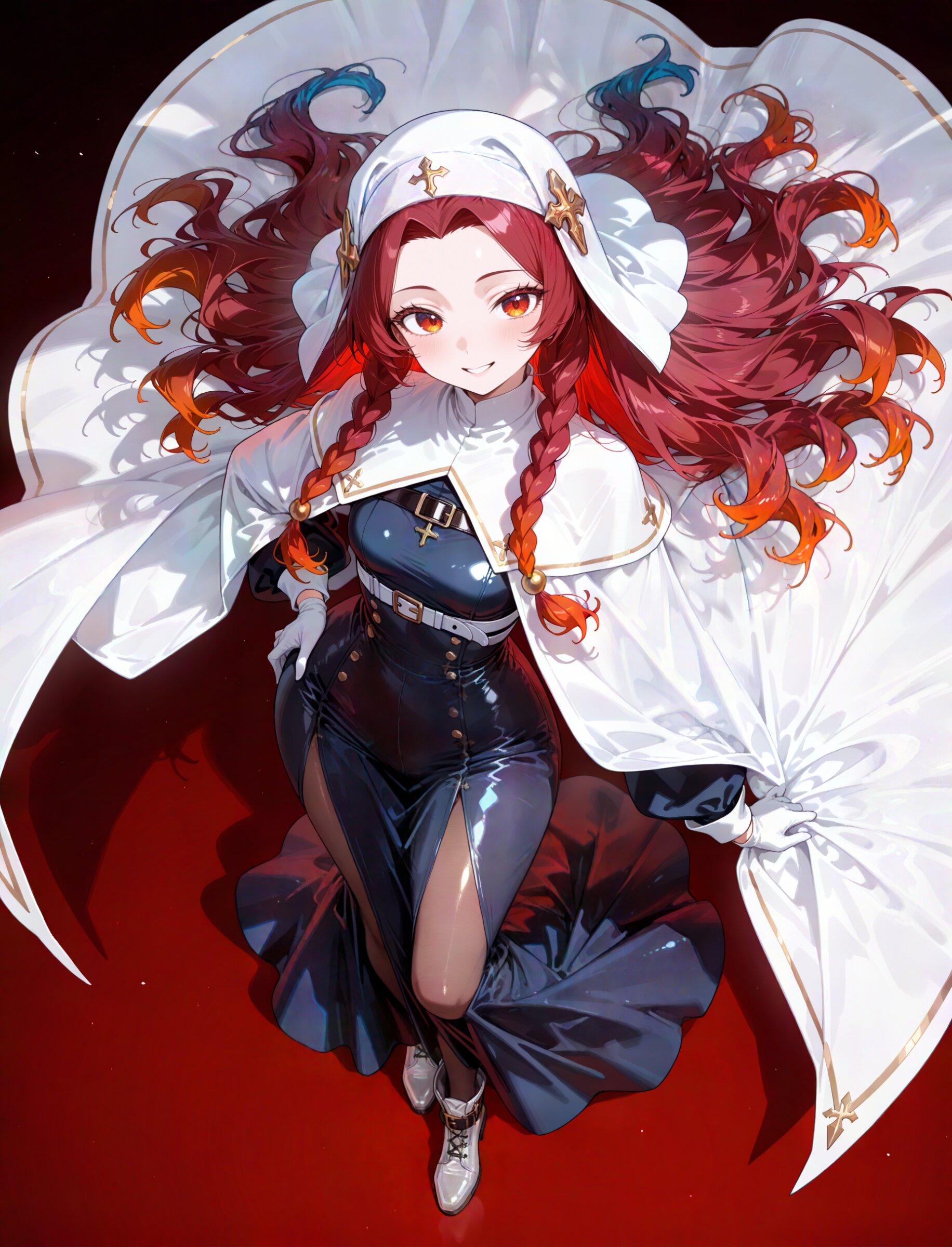from behind, thrust out one's hip, looking another (face:1.0) (from above,looking up:1.15) dutch angle, looking at viewer, (simple watercolor background:1.1), drop shadow, colored shadow, The background is a solid, bright skyblue, creating a striking contrast with the intricate, multi-colored design of the character, pop color background, (high saturation:1.2), summer coloring, 1girl, nun, beautiful detailed eyes, holy face, cool Elegant and sophisticated demeanor, (shiny skin:1.0), skindentation, beautiful amber eyes, , multicolored hair, darkorange,red,maroon hair, prehensile hair, side braids widow's peak , shiny hair, first-rate female bodies perfect body beautiful small breasts wide hips, , solo, nun, Good texture Gold hair ornaments, silver plain cape, , black majestic Cope, , the feel of fluffy, , belt buckle, chest belt, , white gloves, , long skirt, (silk overskirt:1.0), grey high-waist pantyhose, ankle boots, shiny smile, (teasing smile:1.1), leaning to the side super fine concept art, 8K, graceful eyes, masterpiece, best quality, amazing quality, very aesthetic, absurdres, newest, professional art lots of details, , overexposure, shiny-glistening, (watercolor style:0.0), (pastel color style:0.5) <lora:noline (1):0.0> <lora:sdxl2-flat2-512b:0.2> <lora:facelightup_xl_v10:0.5>