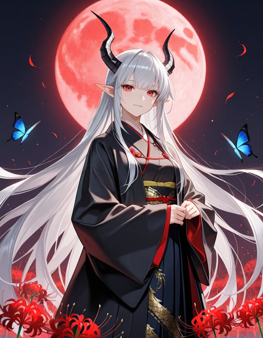 17yo,black dragon horns,silver hair, very long hair,bangs, red eyes,cute girl,slender,Very long sleeves that cover wrists,dragon girl,dragon ears,pointy ears,light smile,closed mouth,black japanese clothes,black haori,long japanese clothes,flower patterned kimono,slender girl,cowboy shot,BREAK japanese art style,japanese background,spider lily,large blue butterfly,red fullmoon,from side BREAK highres,ultra detailed,(masterpiece, best quality),beautiful detailed glow,best illuminate,(ultra detailed),extremely detailed CG unity 8k wallpaper,Highly Detailed beautiful and aesthetic,high resolution,detailed,intricate details,hyper detail,sharp detail,detailed,highres,intricate details,amazing quality,very aesthetic,high resolution,ultra-detailed,absurdres,newest,scenery,rendered,depth of field,volumetric lighting,