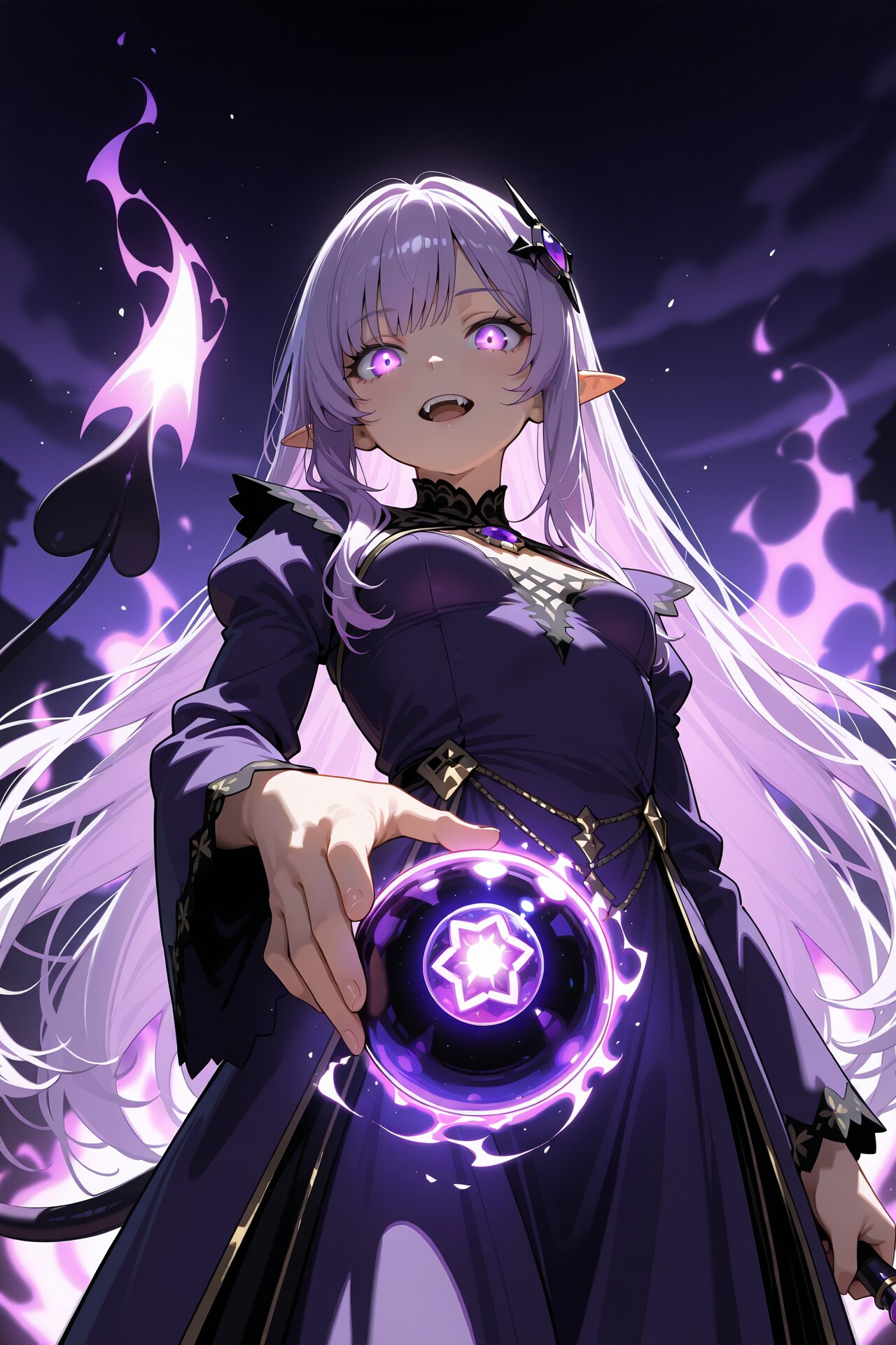 clothed female, masterpiece, best quality, absolutely resolution, newest,digital-cel, photo background, blurry background, depth of field, (photo body:0.3), three quarter view, from below, close up, looking at viewer, purple aura, hand up, holding glowing purple jewel ball, holding wand, purple clothed female, straight hair, medium bangs, naturally flowing hair, left hair ornament, Light purple hair, very long hair, purple eyes, pointy ears, fangs, small breasts, purple devil's tail, Rainy purple sky, dark purple sky, dark night, glowing eyes, purple dress representing the attributes of darkness, dark purple effect is released from purple jewel magic wand, jet-purple and purple vortex in background, shadow, Light particles, magic aura, glowing aura, dark fantasy, purple magic,