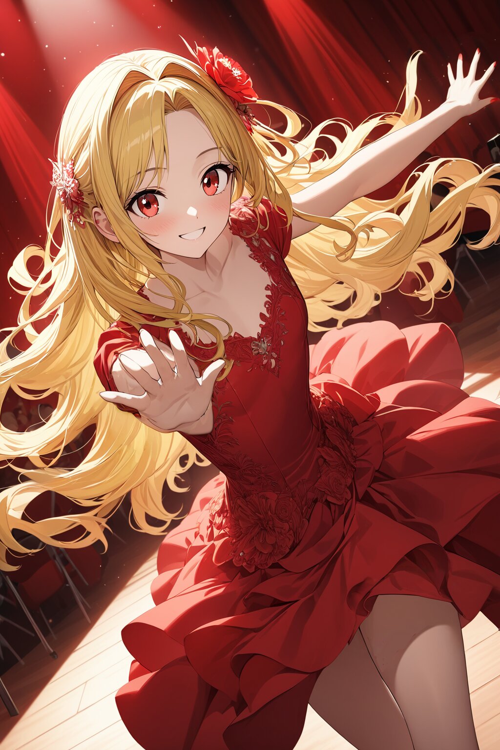 1girl, red theme,spot light,stage lights,dance hall, (tall:1.3),(young),slender, flat chest, (lemon yellow hair),absurdly long hair,(center parted bangs),(hair intakes:1.3),wavy hair,sideburns, (garnet red eyes),Jig eyes,(tsurime), blush,sneer,smile, red princess dress,red high heels,red flower hair ornaments, dancing, cowboy shot,dynamic angle,looking at viewer, ((best quality)),((very high resolution)),full color,((ultra detailed)),extremely detailed CG,super fine illustration, perfect anatomy,perfect hands,super detailed skin, (beautiful eyes,detailed eyes,clear eyes,perfect eyes),high-quality face,extremely detailed face, manga style,hyperrealistic,