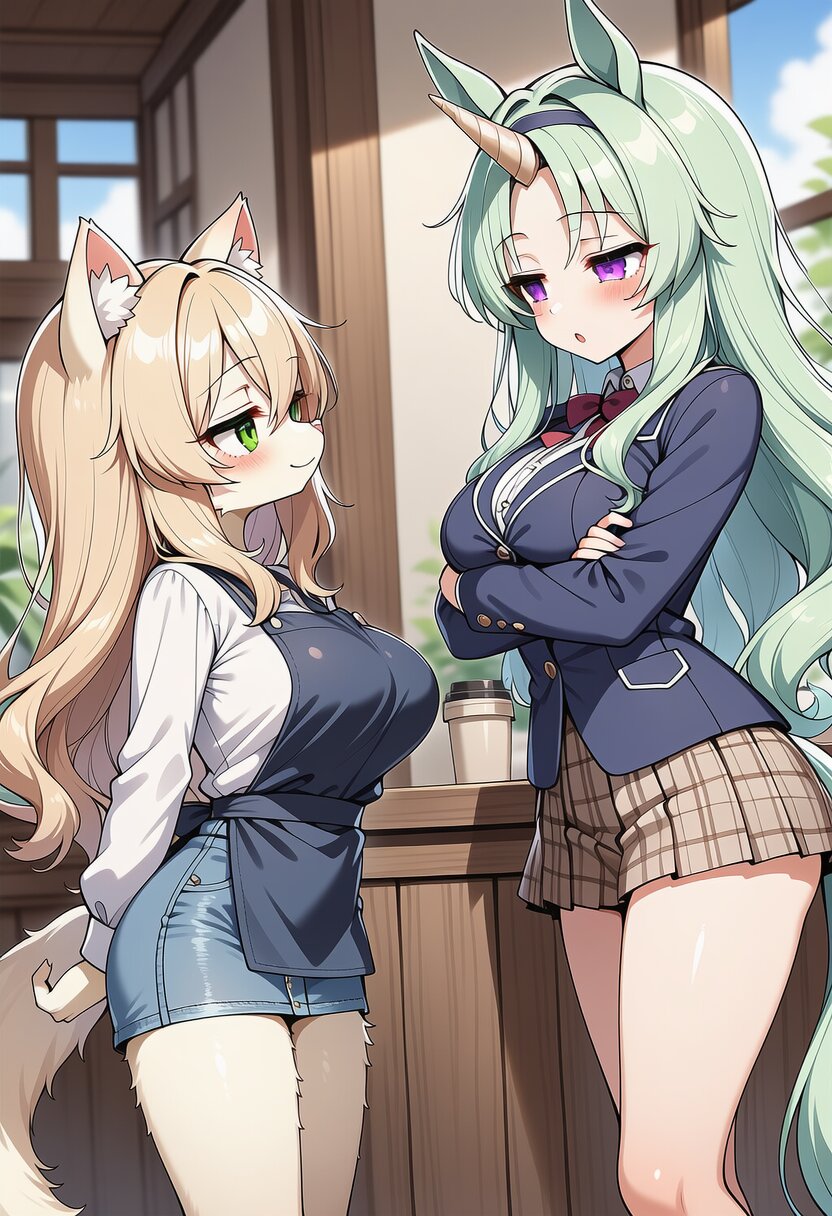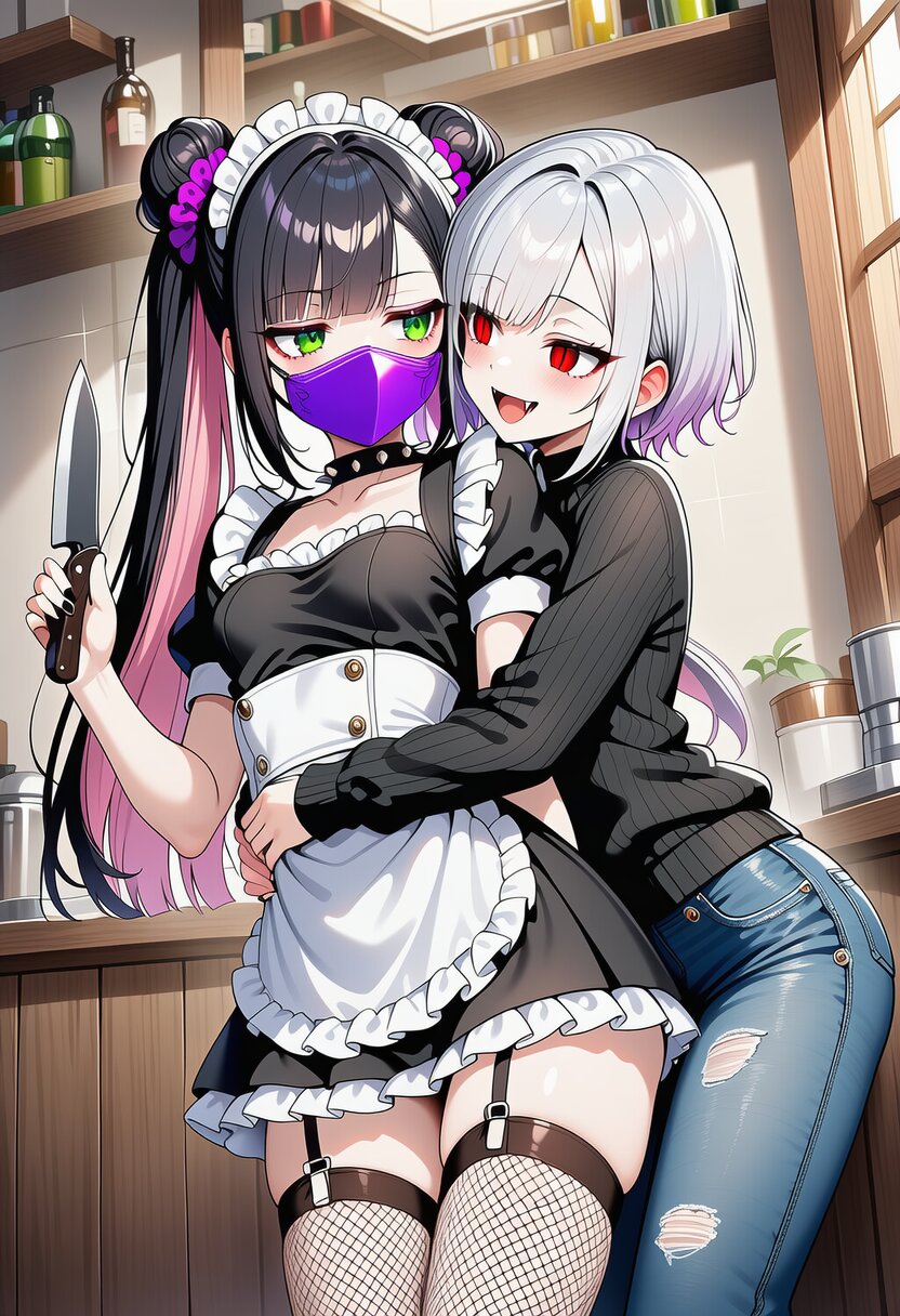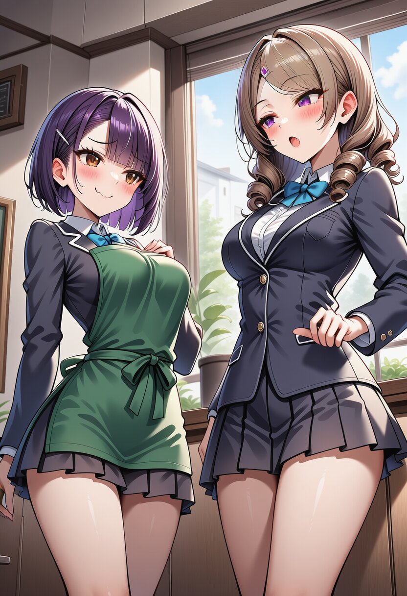 ai-generated, year 2024, anime style, 2girl, yuri, looking at each other, midday, indoor, in cafe kitchen, dynamic angle, masterpiece, best quality, ultra detailed, perfect fingers, high resolution, absurdres, perfect anotomy, detailed background, unity 8k wallpaper, location, -5.5::solo::, -2.5::sky::, very aesthetic, masterpiece, no text