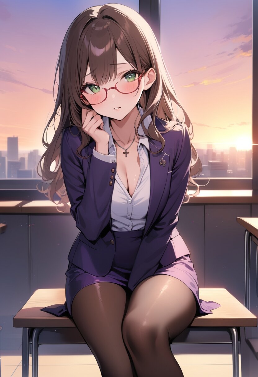 1girl, solo, 15years old, looking at viewers, curl outward hair, long hair, brown hair, green eyes, semi-rimless red-framed eyewear, necklace, collarbone, cleavage, dark purple formal suit, white-dress shirt, dark purple pencil skirt, brown pantyhose, medium blest, parted lips, blush, embarrassed, hand on own chin, (at sunset), indoors, class room, sitting on table, cross-legged, glossy skin, dented skin, thighs,