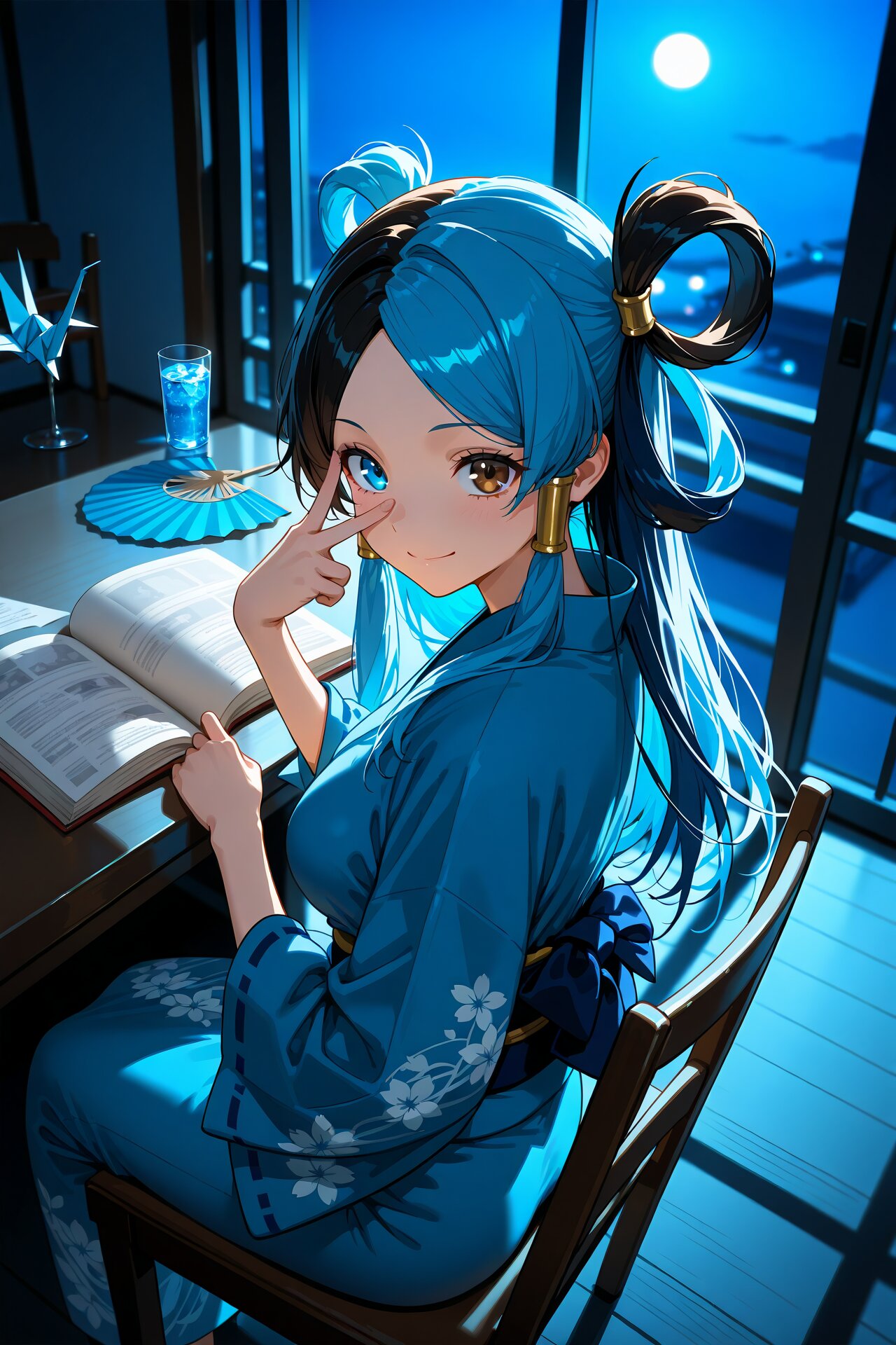 clothed female, masterpiece,best quality, absolutely resolution, newest,digital-cel, photo background, blurry background, depth of field, (photo body:0.3), Reading a book, a glass of blue soda, sitting, chair, v over eye, Paper cranes on table, Blue fan, blue paper crane, Folding hand Fan, Cover mouth with hand fan, looking back, from above, close up, simile, looking at viewer, blue light, dark room, blue room, window, dark room, (split-color hair), Heterochromia, blue hair, blue eye, blue sky, night, blue moon, moonlight, dramatic lighting, blue dress, blue yukata, blue kimono, perfect center part, parted bangs, hair rings. hair tubes, black hair, brown eye, long hair, blue ribbon trim, medium breasts, smile,