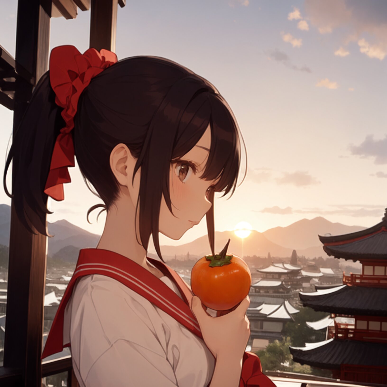 masterpiece, best quality, 1girl, kawaii, red Sailor suit, black hair, hair, ponytail, short hair, white scrunchie, holding a little little Japanese red persimmon, red sun, red sunset sky, the shadow of the five-story pagoda, mountains, Close-up of girl,