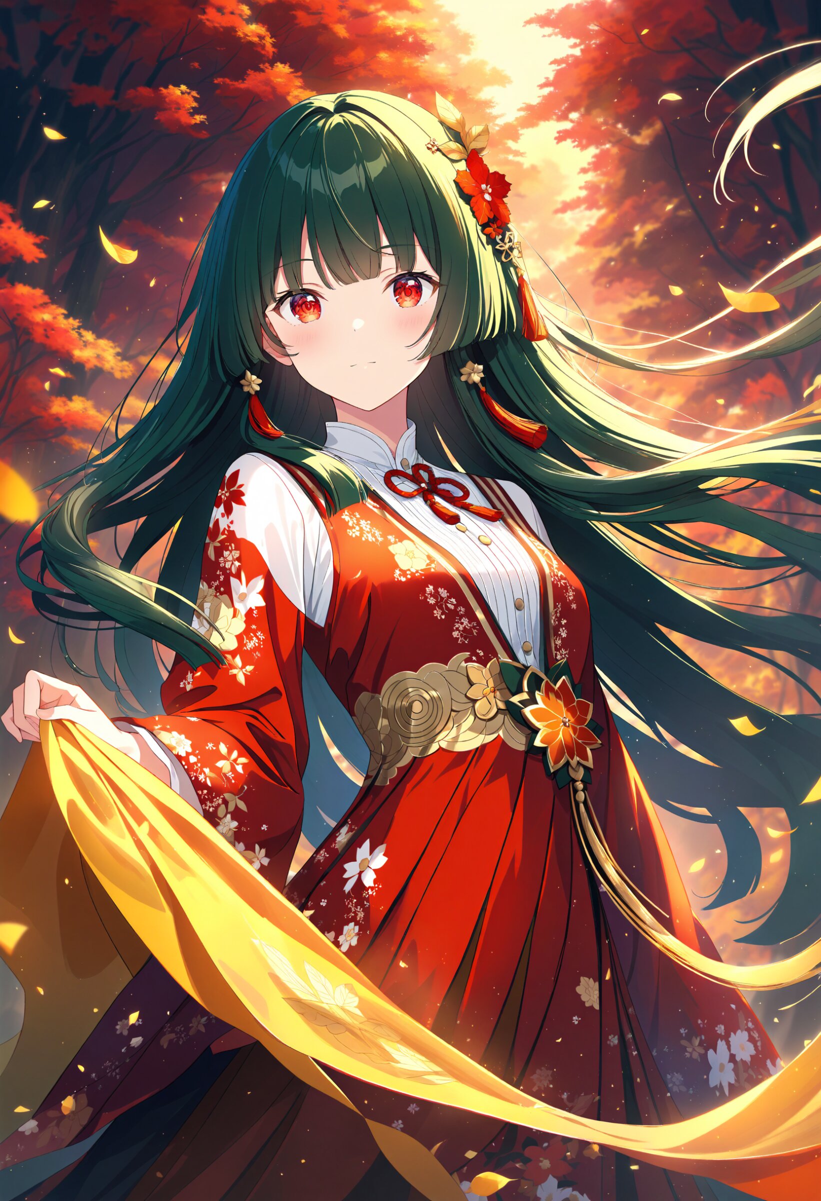 masterpiece, best quality, ultra-detailed, high resolution, perfect anatomy, beautiful detailed eyes, beautiful detailed face, girl, dark green hair, long hair, hime cut, red eyes, small breasts,(elegant autumn fashion), deep red long dress with floral embroidery, golden leaf accessories, flowing fabric, warm autumn sunset lighting, graceful and luxurious