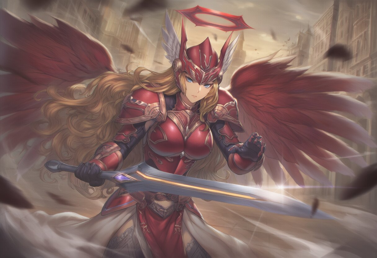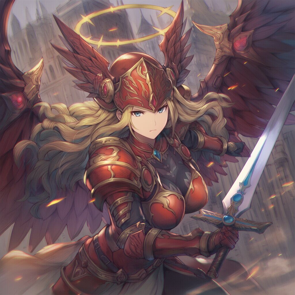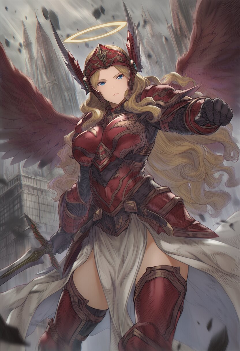 {{{highly detailed}}}, {{official style}}, {{game cg}}, {{intricate}}, {{{detailed beautiful eyes, detailed beautiful face, detailed beautiful face and eyes}}}, {{slender}}, {{25 year old women}}, {{adult women}}, 1girl, solo, blue eyes, {{{tsurime}}}, blonde hair, forehead, {{long hair, wavy hair}}, big breasts, medium breasts, serious, holding a sword, cowboy shot, {{{luster of red, helmet, glove, valkyrie red armor, angels, halo, mechanical dark red wings}}}, city, fighting stance, {{{{{{battle, motion blur effect, motion blur, dynamic motion}}}}}}, {{{masterpiece}}}, {{{best quality}}}, {{{very aesthetic}}}, {{{ultra-detailed}}}, {illustration}, {{{extremely detailed}}}, {{{an extremely delicate and beautiful}}}