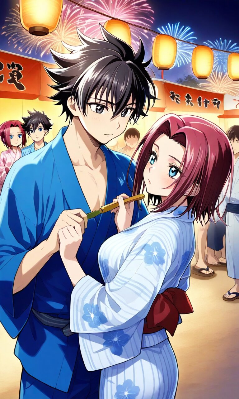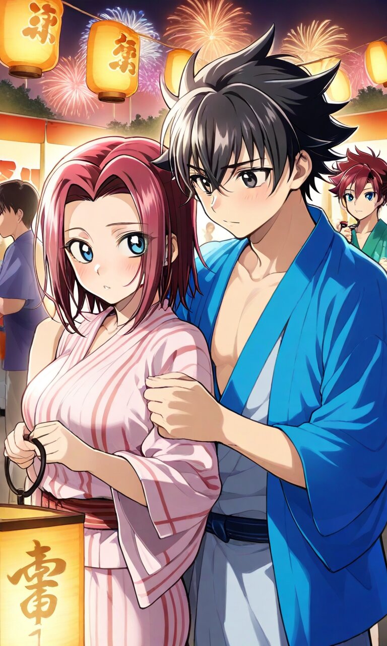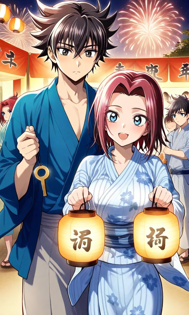 Couple, boy and girl, two people only,absurdres, ultra-detailed, master piece, high resolution, 8k, Boy, girl, couple, Masterpiece, best quality, extremely detailed, young couple at Japanese summer festival, young man and young woman, woman in colorful yukata, man in jinbei, holding matching keychains, hands brushing subtly, festival stall with lanterns, bustling crowd with fireworks, warm summer night, perfect anatomy, romantic festival vibe. BREAK the boy(original boy,black hair,short hair, black eyes) BREAK the girl(Kouzuki Kallen,Red hair, short hair, blue eyes, large breaths)