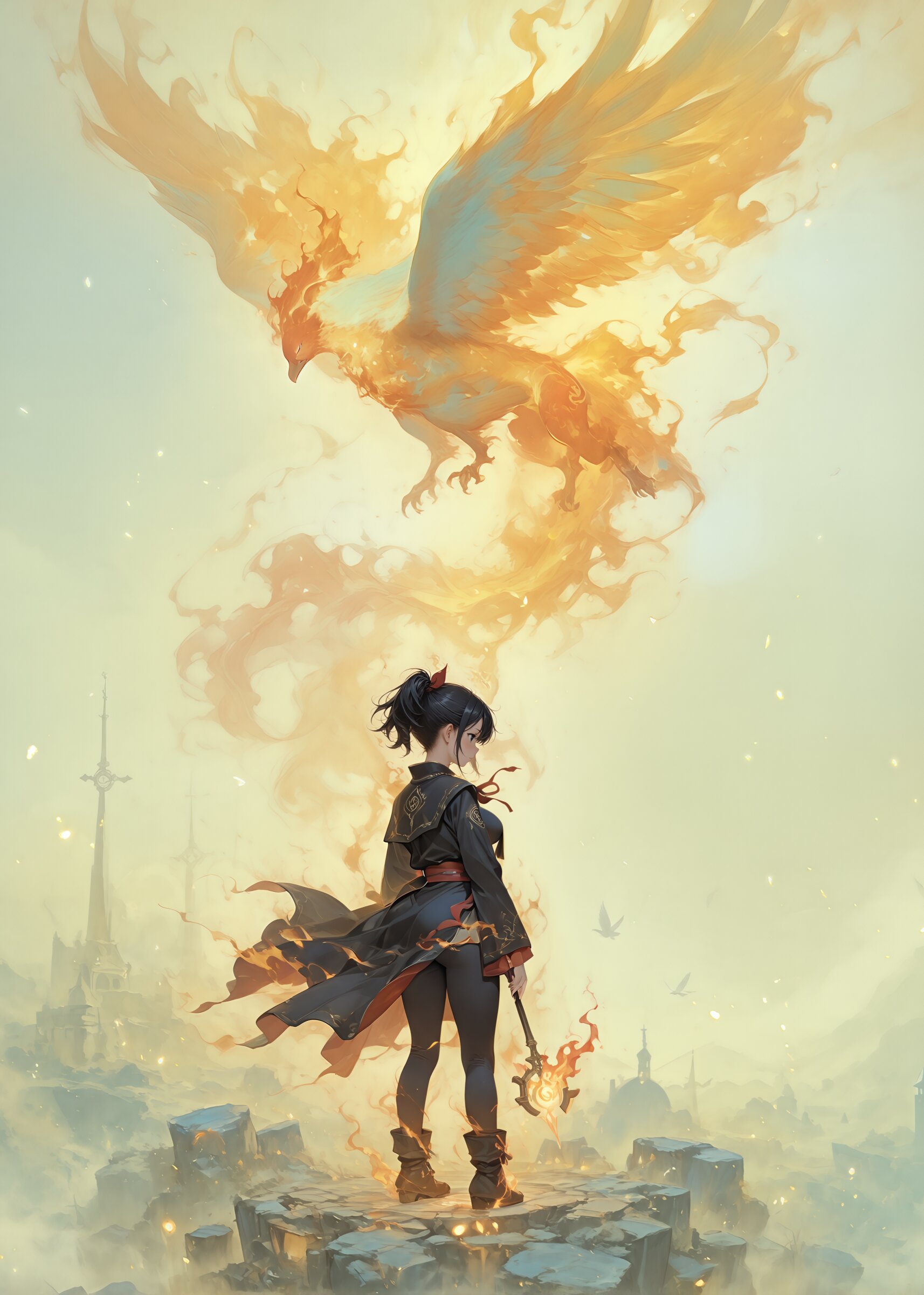 Best quality, Masterpieces, 1girl, (young girl), cute face and eyes, black hair, clear black eyes, single short ponytail hair, big breasts, Vigorous, lively, and spontaneous personality, wearing sacred ritual attire in white and red, illuminated by divine golden flames, facing a majestic fiery phoenix, wings spread wide, glowing feathers like light, flames symbolizing life and rebirth, holy aura, mystical and cinematic confrontation scene