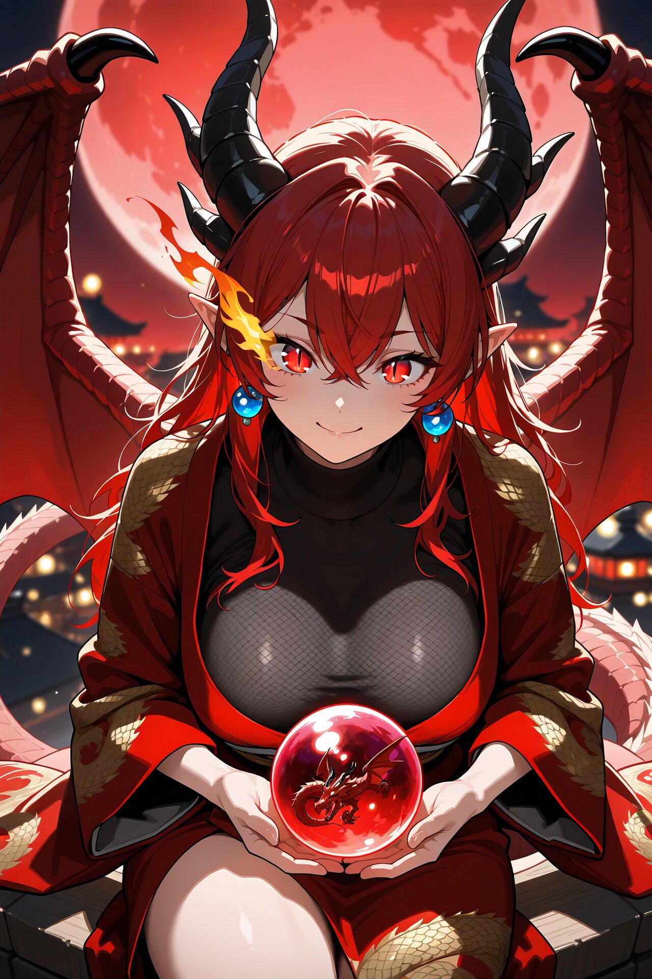 clothed female, masterpiece,best quality,absolutely resolution, newest,digital-cel, photo background, blurry background, depth of field, (photo body:0.3), 1girl, red eyes, red hair, dark blue mesh hair, Crossed bangs hair between eyes, artistic Messy Side hair, Has some stray hairs, medium long hair, Enchanted jewelry, pointy ears, big gemstone earrings, voluptuous, well endowed, full bust, Healthy and thin, chest Dragon scale, Shoulder Dragon Scales, dragon horns, red dragon wings, red dragon tail, slit pupils, tareme, Slightly eyebrows, thin eyebrows, bare hand, Horns on the sides of the head, horns that extend backwards, horns with a wooden texture, gnarled horns, red costume, sheer fabric, red Turtleneck undershirt, mesh top, covered chest, closed collar, modest clothing, loose clothing, holding red orb, red Gyokuho, depth of field, blurred background, blurry, blurry background, Bokeh, background, smile, on dragon, thighs, flying dragon, Dragon patterned kimono, red Kimono, red Japanese costume, red clothes, Multi-colored hair, red hair, Mesh hair, red hair, Devil's Horns, Devil's Wings, Riding dragon, big red dragon, red moon, night, red sky, red theme, flaming eye, glowing eye, holding Dragon Horn, (face close up), girl focus, from above,