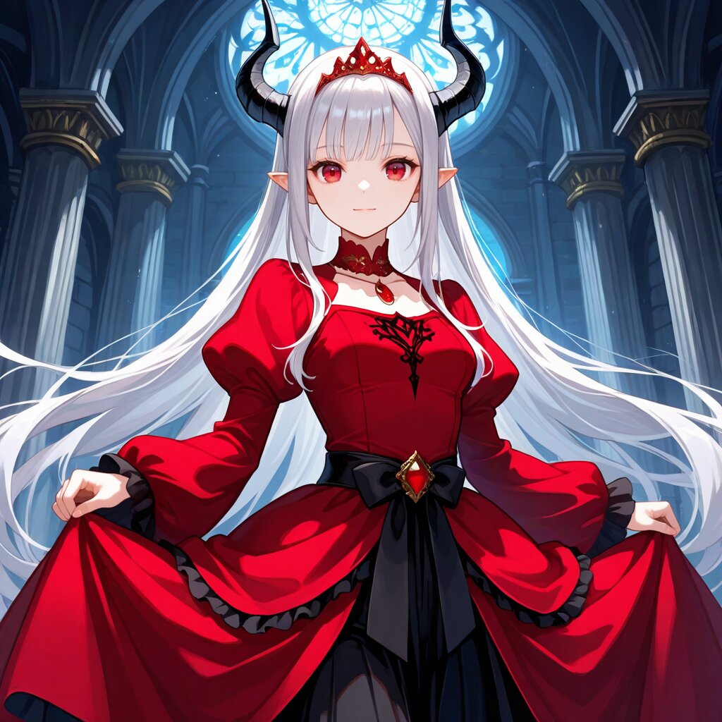 赤眼の赤いドレスとティアラを着用した銀髪竜姫さん