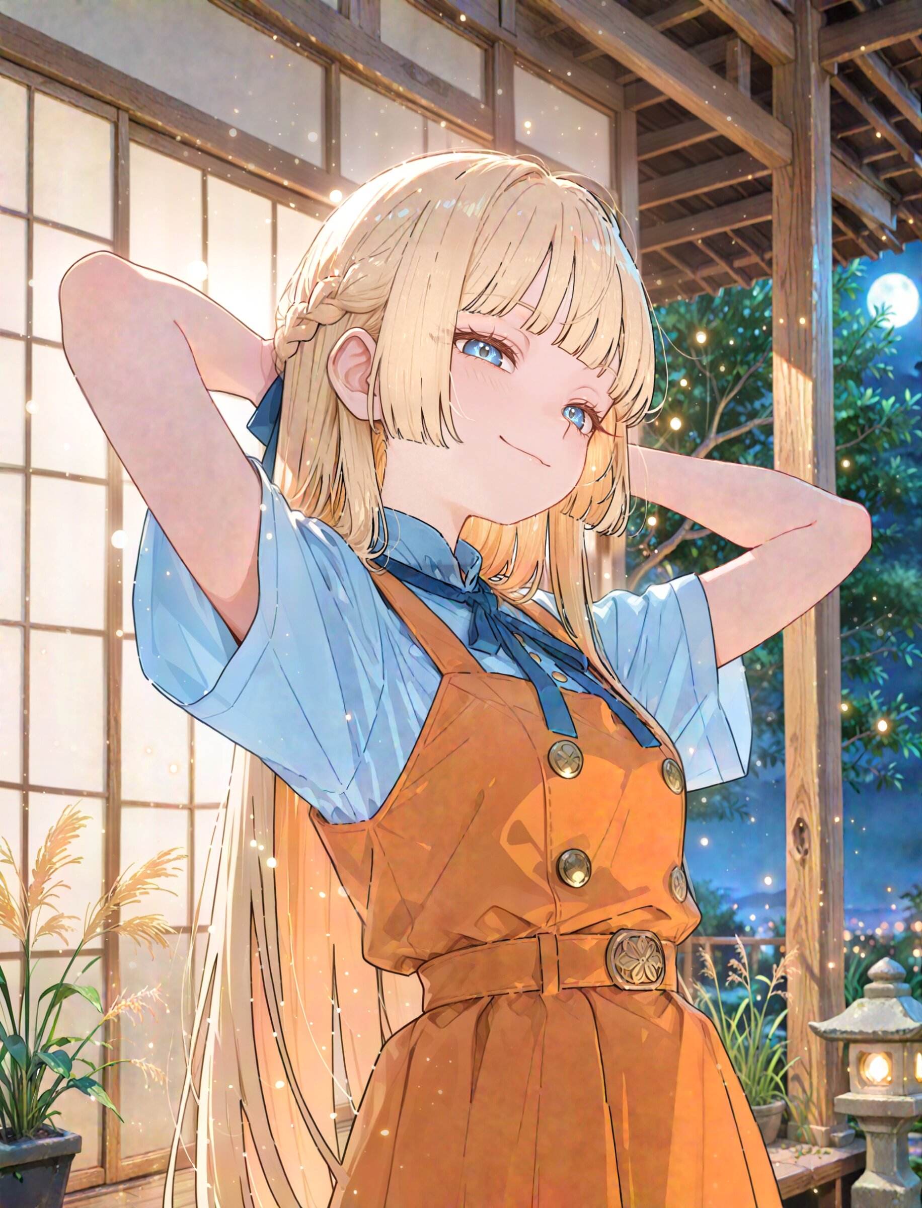 from side, looking at viewer (portrait:1.1) from below, looking down (orange Pinafore dress, blue neck ribbon, blue blouse, 4gold buttons, 1girl (13yo:1.1), short sleeves very long hair, french braid, straight hair, hime cut, blond hair, blue eyes, closed mouth smile, smug expression, conceited, self-satisfied, arrogant, arms behind head:1.0), shouji, sliding doors, veranda, stone lantern, , depth of field, bokeh, dim lighting, moon, moonlight, , tsukimi, susuki grass, super fine concept art, hard surface, 8K, unreal engine, masterpiece, best quality, amazing quality, very aesthetic, absurdres, newest, professional art lots of details, , overexposure, sumie effect style, 4ur4_illu,shiny, glowing, glowing particles, glowing light particles, light particles, orange wind, <lora:noline (1):-0.5> <lora:sdxl2-flat2-512b:0.15> <lora:facelightup_xl_v10:0.5> <lora:V2_yakumo_alchemy:0.5> <lora:Aura_illu:0.1>