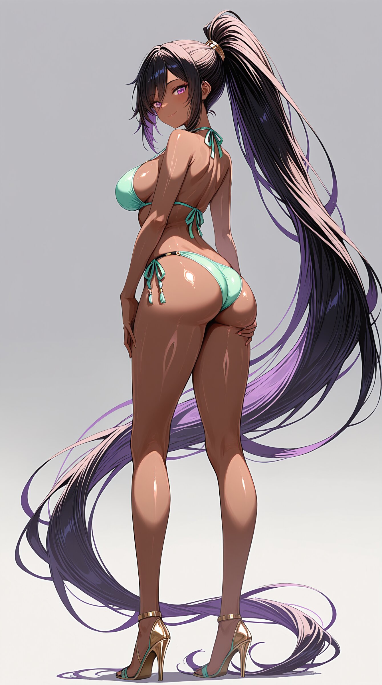 1 cute girl,(light Green bikini),(dark skin),(smile),(high heel),(standing),(long legs:1.4), (smile),(absurdly long black hair), (high ponytail),( bangs), (very narrow purple eyes), (glossy skin:1.5), (from side),(from behind),(looking at viwer), masterpiece, best quality, ultra-detailed, 8k resolution, very aesthetic <lora:noobai_ep11_stabilizer_v0.11_fp16:0.7> <lora:StS-Illustrious-Detail-Slider-v1.0:2.> <lora:sdxl-hairdetailer_02:2> <lora:xl_more_art-full_v1:1>