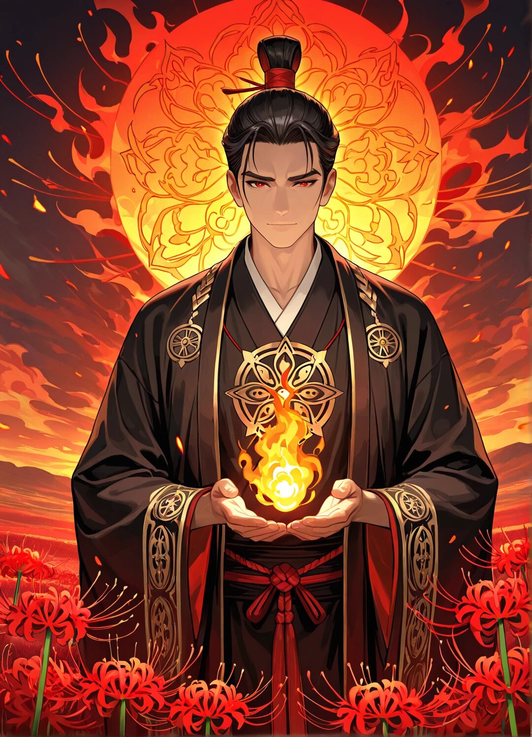 Full-body portrait of Kagutsuchi, the Japanese god of fire, wearing a majestic crimson Shinto ceremonial robe (Shōzoku) with golden flame patterns. He stands in a vast field of glowing red spider lilies under a radiant sunrise. Embers float gently around his body, his calm expression radiating both power and protection. Cinematic, spiritual, ultra-detailed, high resolution.