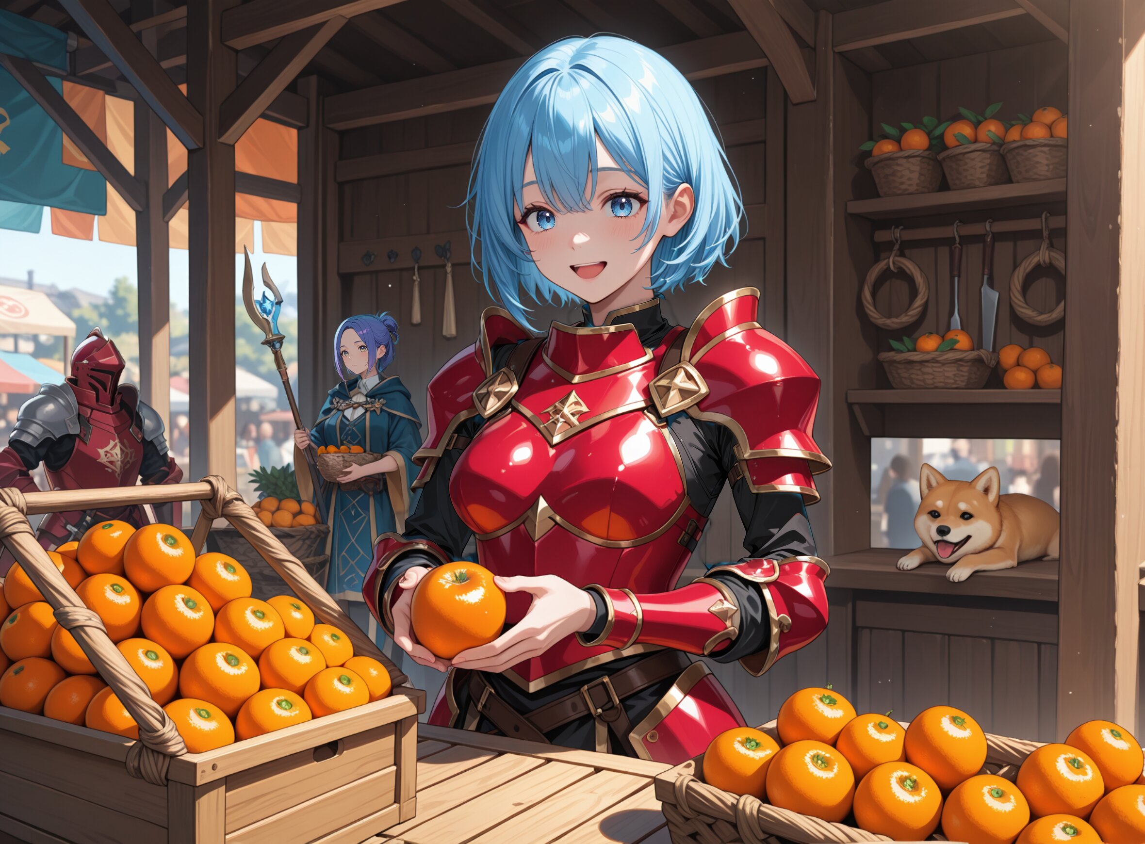 新たに鍛え上げられた剣を腰に携え、彼女と柴ワンコは市場へと足を運ぶ。