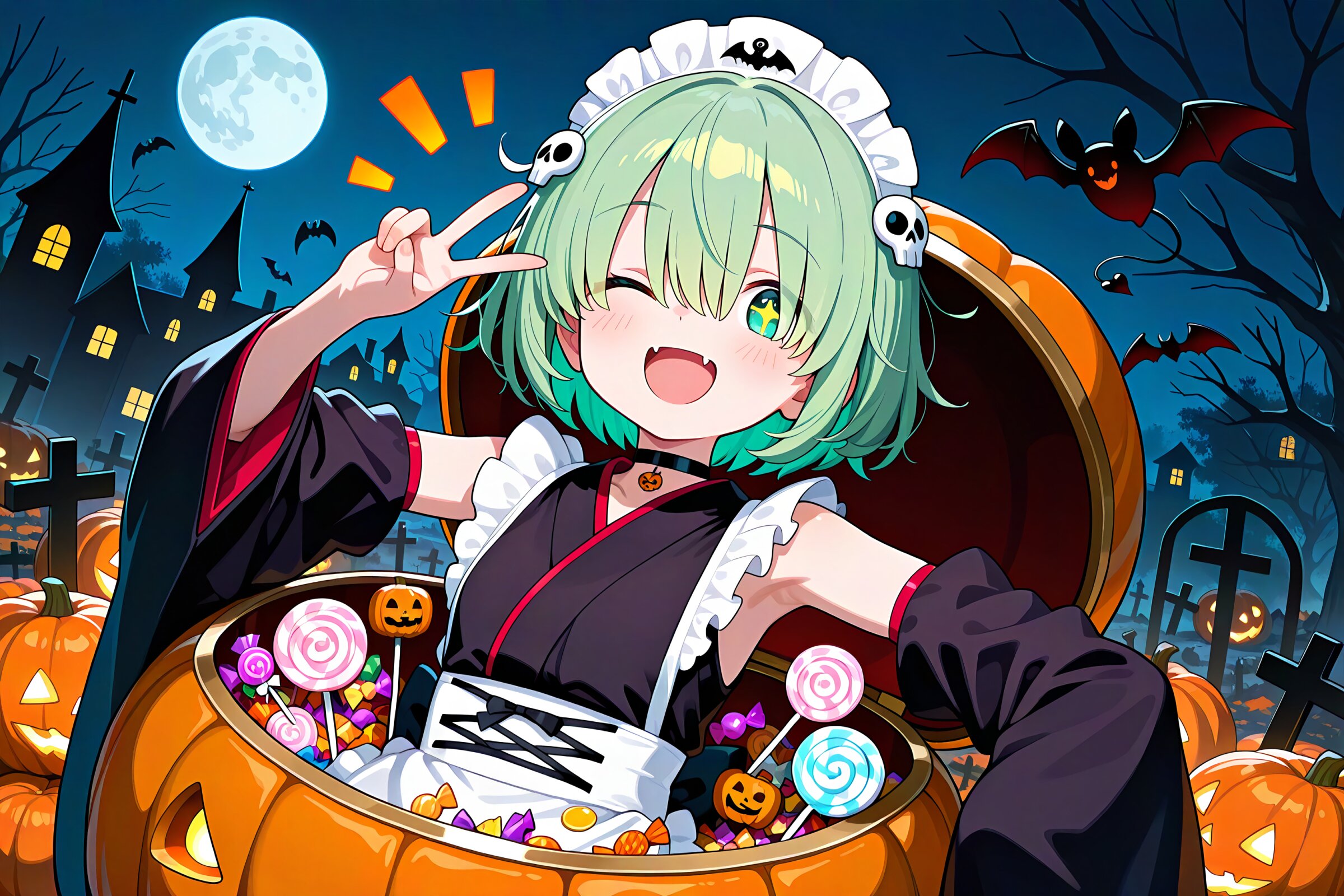 1 little girl, solo, diagonal angle, upper body, masterpiece, best quality, amazing quality, very aesthetic, cobalt green hair, short hair, messy hair, (hair over eyes:1.2), green eyes, demon fangs, +_+, open mouth, smile, cheerful, +++, notice lines, one eye closed, choker, halloween wa maid outfit, (oversized sleeves:1.2), detached sleeves, (floating black ghosty hands:1.2), skull hair ornament, halloween costume, in mimic pumpkin chest, v, halloween candy, holding a halloween lollipop, halloween, night, pumpkin, moon, bat, graveyard, autumn,