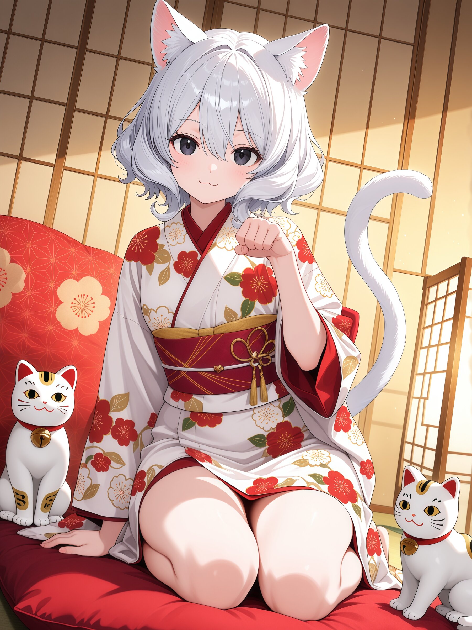 (masterpiece, best quality, ultra-detailed, intricate details, anime style, 8k illustration, soft colors) 1girl, white cat ears, black eyes, white wavy bob hair, hair between eyes, loose inward curls, natural cat tail, curvy, :3, looking at viewer, sitting on a red cushion like a traditional maneki-neko, one hand paw pose, sitting politely in a kneeling pose, white japanese clothes, red floral print, charming outfit with a small bell accessory. Soft warm lighting, cozy Japanese atmosphere, dynamic angle,