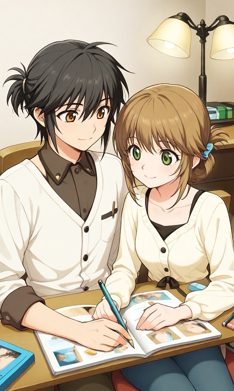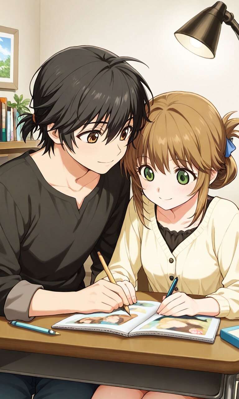 Couple, boy and girl, two people only,absurdres, ultra-detailed, master piece, high resolution, 8k, Boy, girl, couple,Masterpiece, best quality, extremely detailed, young couple in cozy manga studio, young man and young woman, casual artist attire, sitting close at desk, woman sketching on tablet, man inking manuscript, scattered art supplies, warm desk lamp glow, shared smiles, perfect anatomy, romantic creative collaboration. BREAK the boy(Jude Matisse, black hair,brown eyes,) BREAK the girl(leiax2, brown hair, green eyes, tied hair, sidelocks, short hair, )