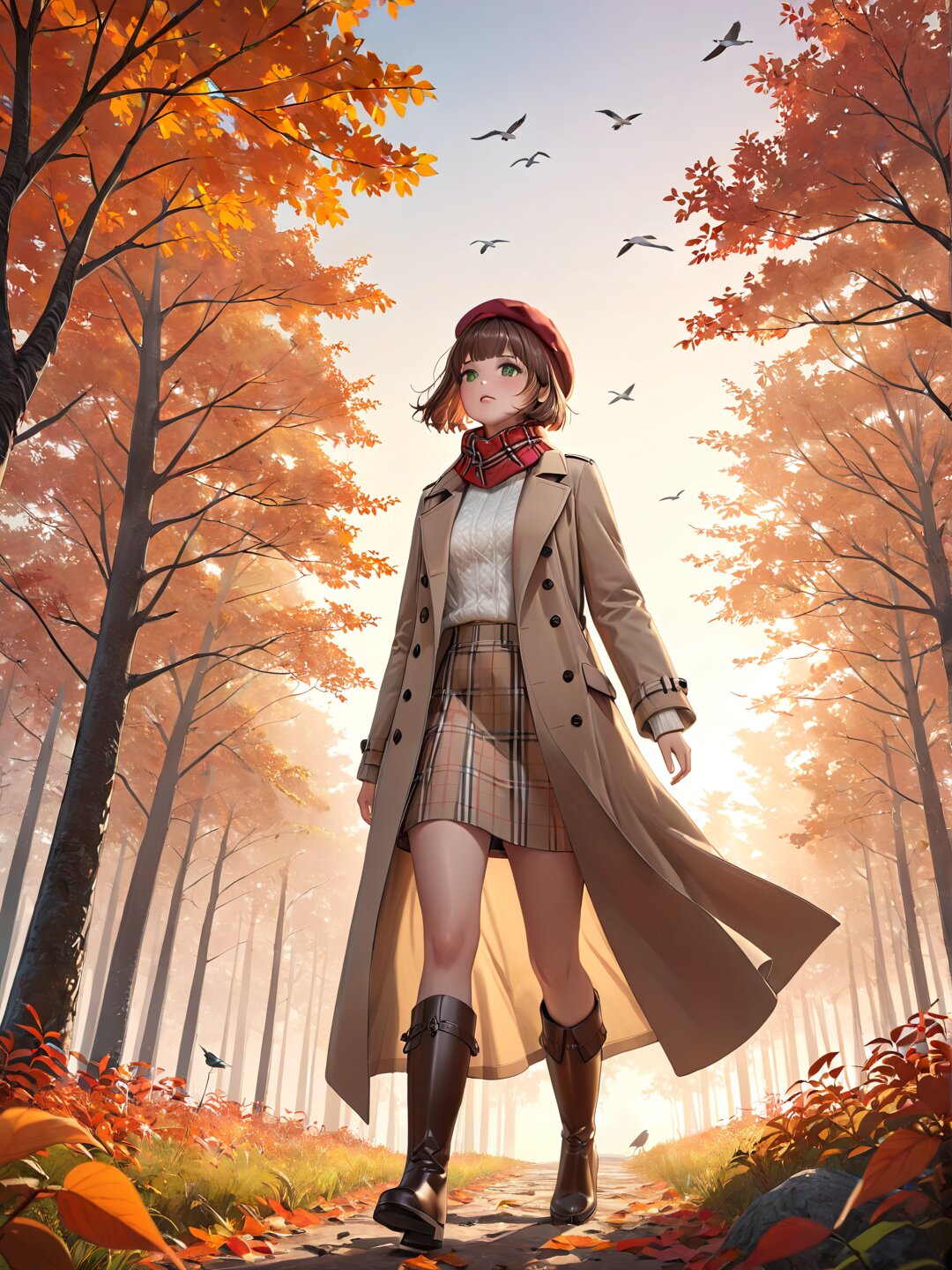 solo,1girl,ahoge,green eyes,brown hair,blunt bangs,short hair,hime cut,eye shadow,orange cheek,orange rips,eye liner,(baige long coat:1.2),burberry check scarf,(white knit sweater),tartan plaid skirt,(baige long boots:1.5),Beret,Autumn forest,colorful leaves,looking up,wind-blown leaves,long shot,impressive panoramas,(((migratory birds))),delicate face,detailed face,detailed skin,masterpiece,best quality,insanely detailed,beautiful,16k,photorealistic,standing,detailed skin,detailed face,outside,in the evening,hazy atmosphere,calm atmosphere,photorealistic,from below,lens flare,golden hour,bloom,soft lighting,red hues