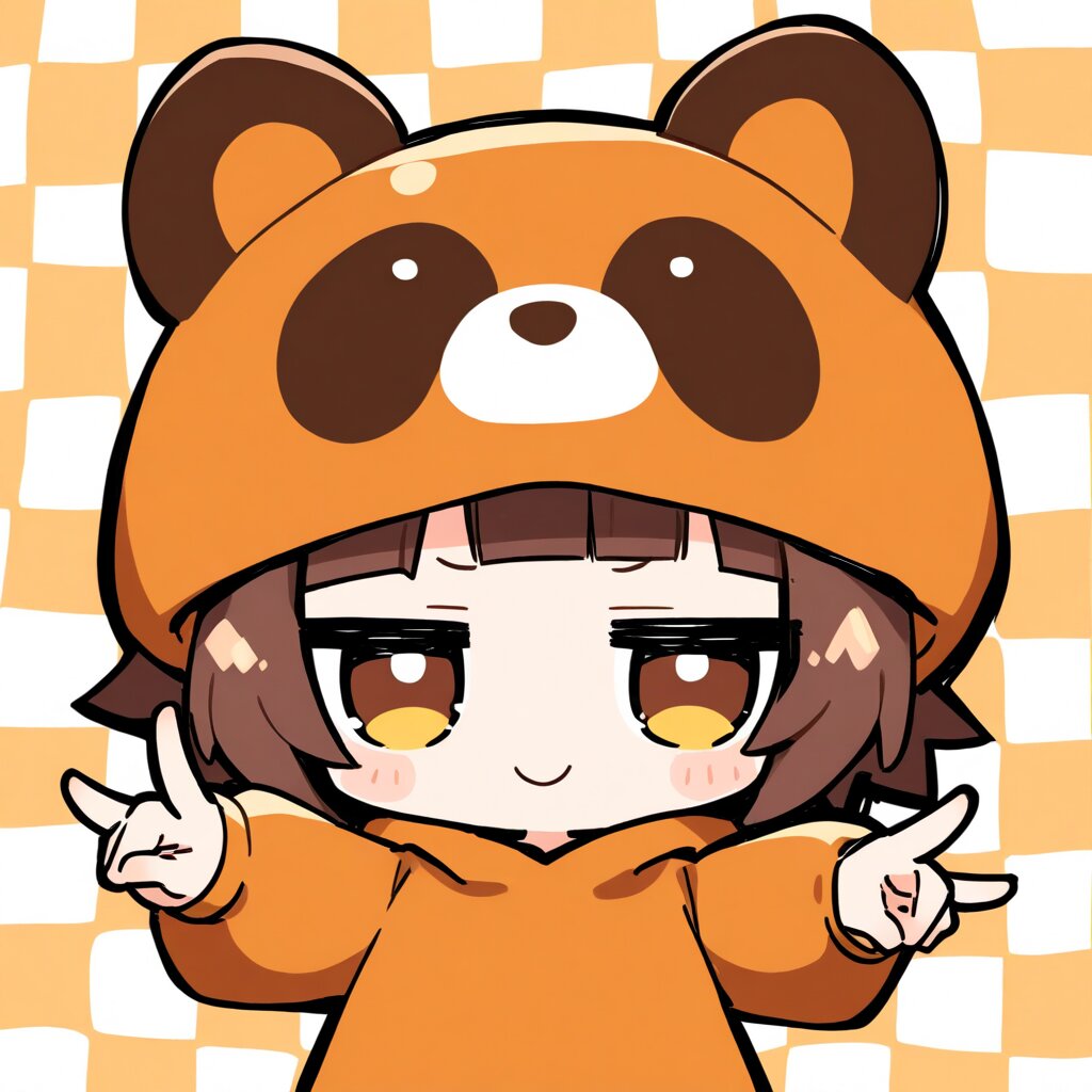 extreme chibi, 1girl, solo, brown short hair, bangs, orange tanuki hoodie:1.6, round tanuki ears:1.2, double fox shadow puppet, smile, jitome, orange and white checkered background:1.2, BREAK tanuki face hoodie