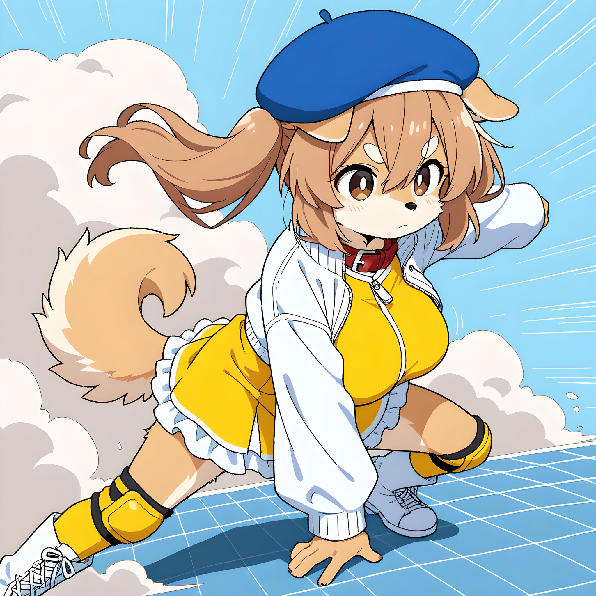 1girl,solo,short female,oppai loli,(dog girl),(shiba-inu girl),(furry:1.3),shiba-inu ears,ears stand,shiba-inu tail,(body fur:1.2),stand fur,curled tail,(large breasts),light-brown hair,long hair,high twintail,white thick eyebrows,hair between eyes,brown eyes,round eyes,bright pupils,serious,closed mouth,casual outfit,blue beret,layering,separated cropped jacket and dress,long sleeved jacket,animal collar,white cropped jacket,toggled jacket,long yellow dress,yellow knee pads,knee highs,lace-up boots,sumo,hands on invisible floor,invisible floor,arms down,squatting,legs apart,dust cloud,foreshortening,perspective,motion lines,motion trails,motion blur,speed lines,blue background,grid background,focus face,from side,three-quarter view,looking ahead,((high contrast)),(anime coloring),(kawaii),softy,(2D),(oekaki:1.1),(cute),furry,(two tone fur),(furry body),perfect body,detailed face,high quality,cute clothes,animal tail,animal ears,solo,masterpiece,((correct_anatomy)) , <lora:flat1:0.7> <lora:hairdetailer:0.7>