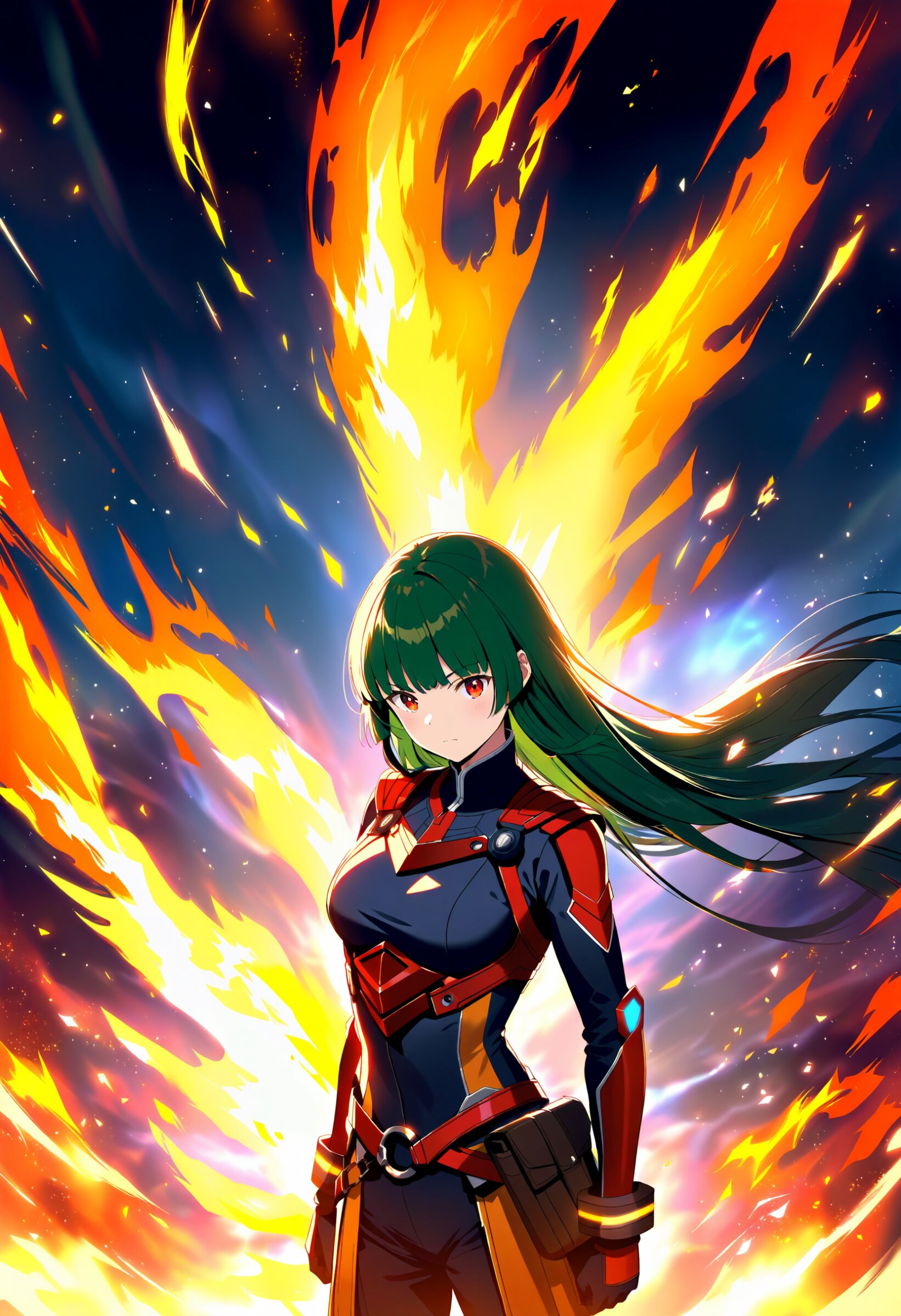 ultra detailed, masterpiece, cinematic lighting, dynamic composition, fiery energy forming a phoenix above her, phoenix spreading its glowing wings dramatically, intense flames and sparks, (a beautiful girl with long dark green hair hime cut and red eyes:1.2), heroic pose, flowing hair caught in the heatwave, fantasy battle outfit, glowing magical aura, ember particles floating around, epic background, powerful atmosphere, high contrast, rim lighting, vivid colors