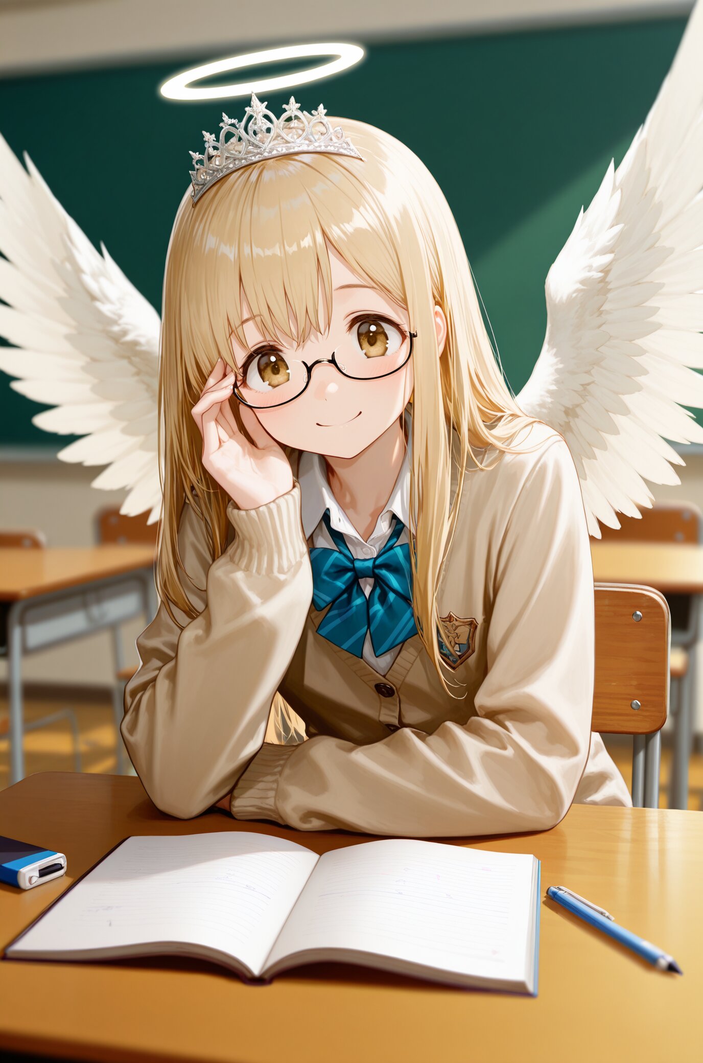 masterpiece, best quality, absurdres, 8k, ultra detailed, aesthetic, very aesthetic, newest, <lora:Fixhands_anime_bdsqlsz_V1:0.5>, <lora:bold-16oa:-0.5>, (realistic:0.3),BREAK (shallow depth of field,Gaussian Blur:1.6),1girl,solo,(school uniform,semi rimless eyewear,:1.0), (smile,happy,tareme:1.3),sitting chair,classroom,table,textbook,notebook,pen,eraser,beige cardigan, blonde hair, long hair, brown eyes, (white angel wings:1.2),tiara,from front,(cowboy shot:1.3),(adjusting eyewear:1.3),(wide angle,wide shot:1.0),<lora:USNR STYLE_XL_loha:0.8>