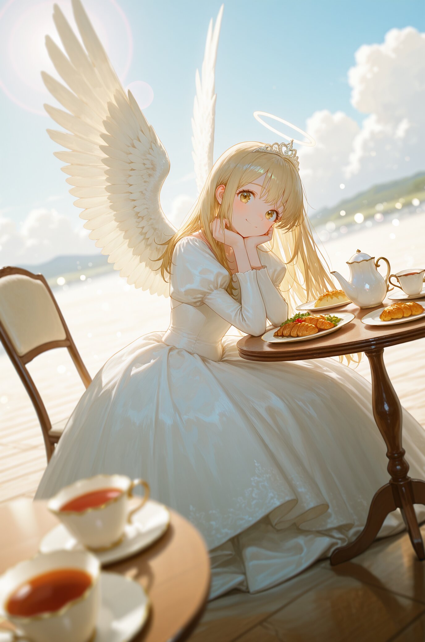 masterpiece, best quality, absurdres, 8k, ultra detailed, aesthetic, very aesthetic, newest, <lora:Fixhands_anime_bdsqlsz_V1:0.5>, <lora:bold-16oa:-0.5>, (realistic:0.3),BREAK (shallow depth of field,Gaussian Blur,manificient views:1.6),lens flare,1girl,solo,(A stunning bride wearing a luxurious white ball gown style wedding dress, princess silhouette,serving tea and plates of food in a heavenly café, fluffy clouds and soft glowing light, kawaii blessing mood, radiant and dreamy celebration with lots of dishes:1.0),(smile,happy,tareme:1.3),sitting chair,across the table,blonde hair, long hair, brown eyes, (white angel wings:1.2),tiara,(looking at viewer,fullbody shot:1.3),closed mouth,(wide angle,wide shot:1.0),<lora:USNR STYLE_XL_loha:0.8>
