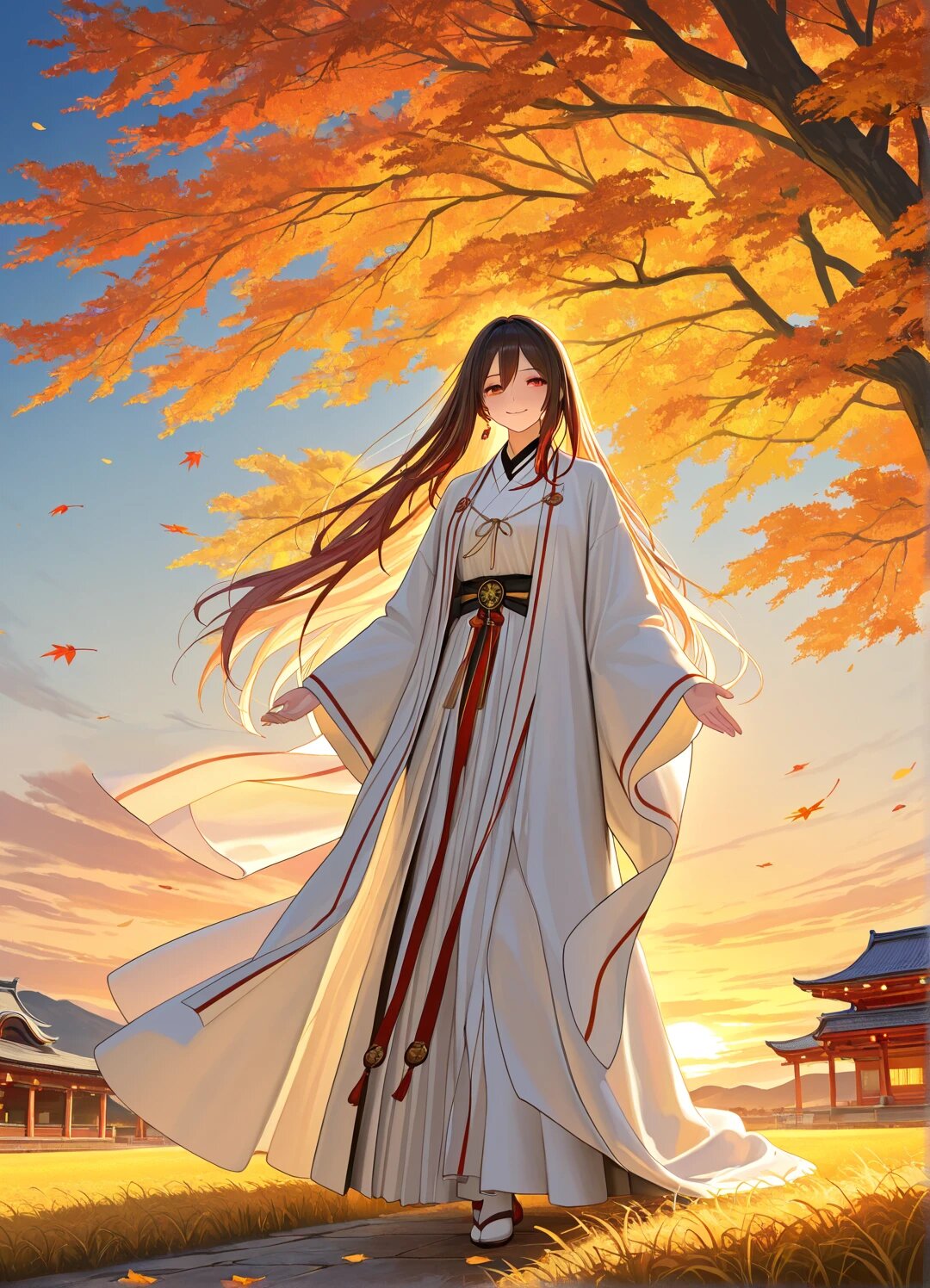Full-body hyper-realistic portrait of Ōkuninushi, the Japanese god of prosperity and nation-building. He wears elegant orange kariginu robes flowing gracefully in the wind, his serene smile radiating warmth and abundance. A single sacred white rabbit rests gently at his side, symbolizing divine connection. He stands alone in golden autumn fields at sunset, the sky glowing with soft amber light. The atmosphere is spiritual and majestic, emphasizing his divine presence. Ultra-detailed, cinematic composition, professional photography style, 8K resolution.