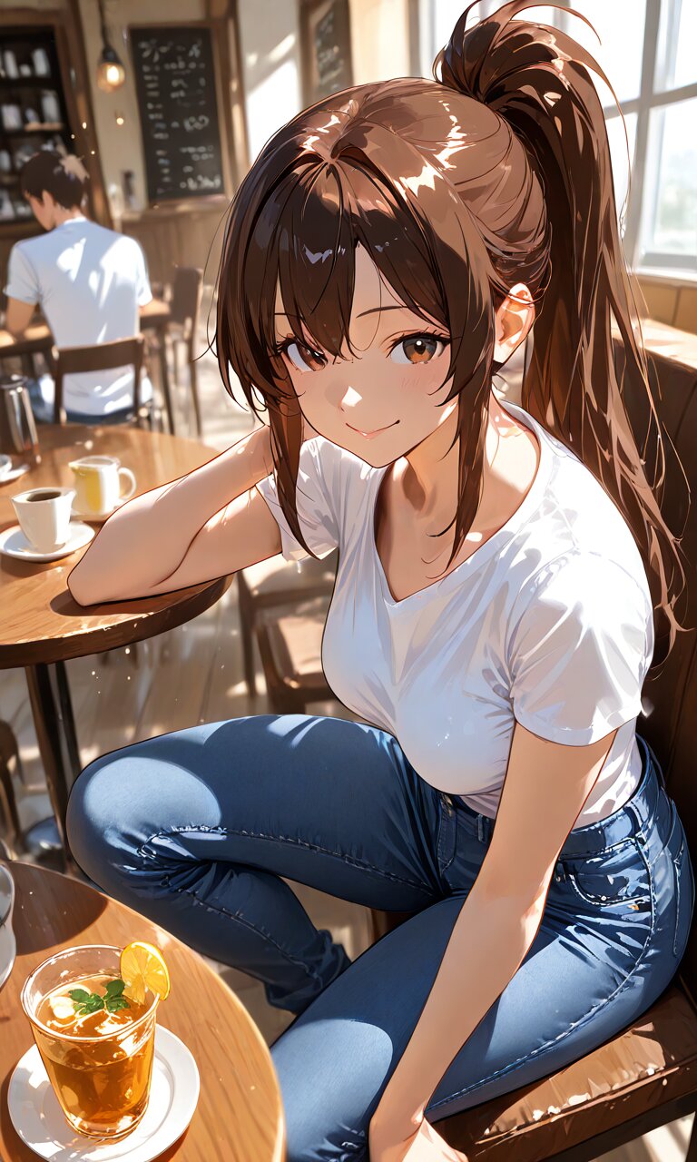 (best quality),(masterpiece),(ultra detailed),1 lady, long ponytail, brown hair, smile, breasts, (lemon tea), cafe, Tshirt, jeans
