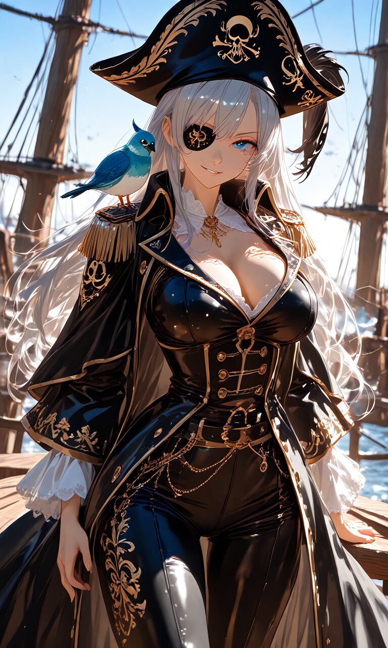 (best quality),(masterpiece),(ultra detailed),,1 lady, long hair, silver hair, blue eyes, , seductive smile, eyepatch,(bird on shoulder), big breasts, (black pirate long pants),(black pirate hat),(black pirate coat)
